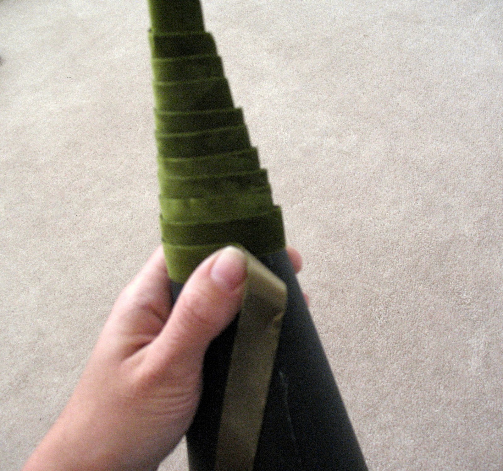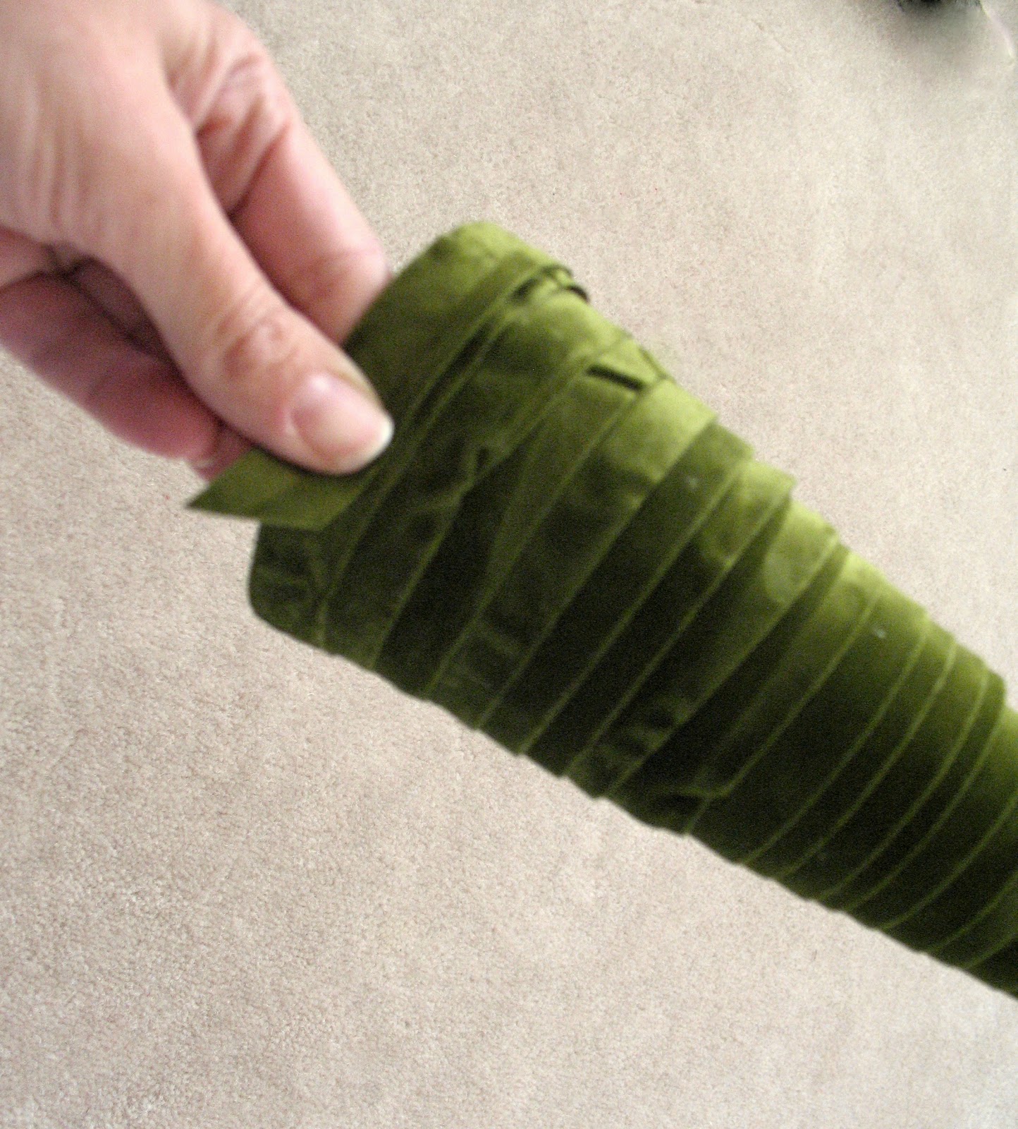 2.  With a yardstick, measure from the point of the cone to where you would like your base to be.  My white pine tree measures 3/8th of a yard from the point, and my largest green tree measures 1/2 of a yard from the point.  Draw an even line all the way around (measuring from the point as you go) with pencil or chalk.  Then cut along that line to form the base of the tree.