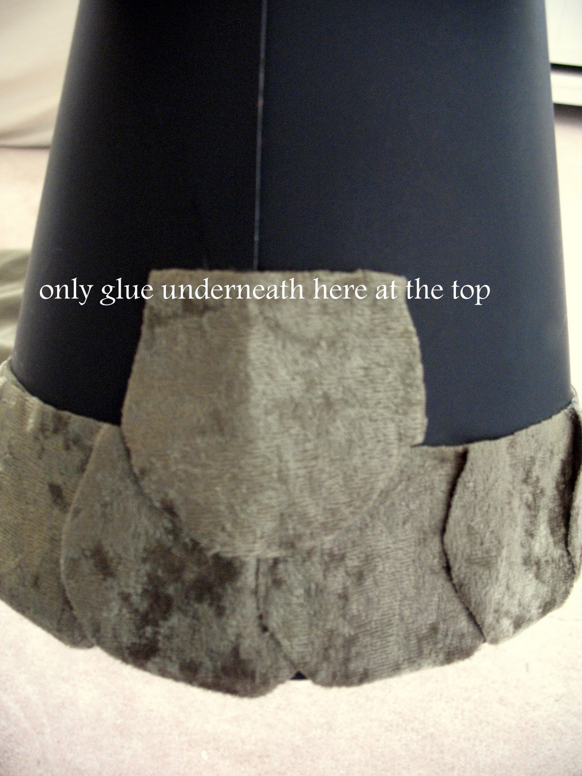 4. Hot glue just along the back of the top of the “U” and position it straight edge side up on the bottom of the cone.  (Let about 1/4″ or so hang off the cone).  Note: you will not be gluing the entire “u” down~just the top edge.