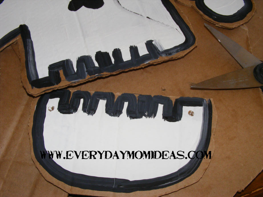 5. Make wholes with the end of scissors into the four corners of the jaw parts to thread the yarn through and and tie the yarn end together so the bottom jaw can now swing.