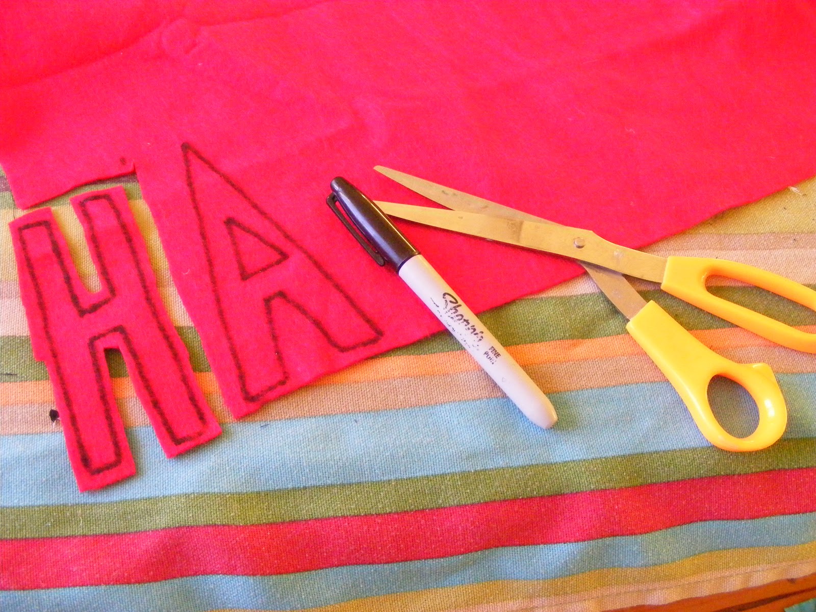4. Next, your going to use the felt for the letters. You can just use a permanent black marker to draw your letters on the felt. Make sure you give at least 1/2 and inch in between letters. Cut out the letters by cutting around the outside of the black marker lines leaving about 1/4 of an inch of felt to outline your letters.