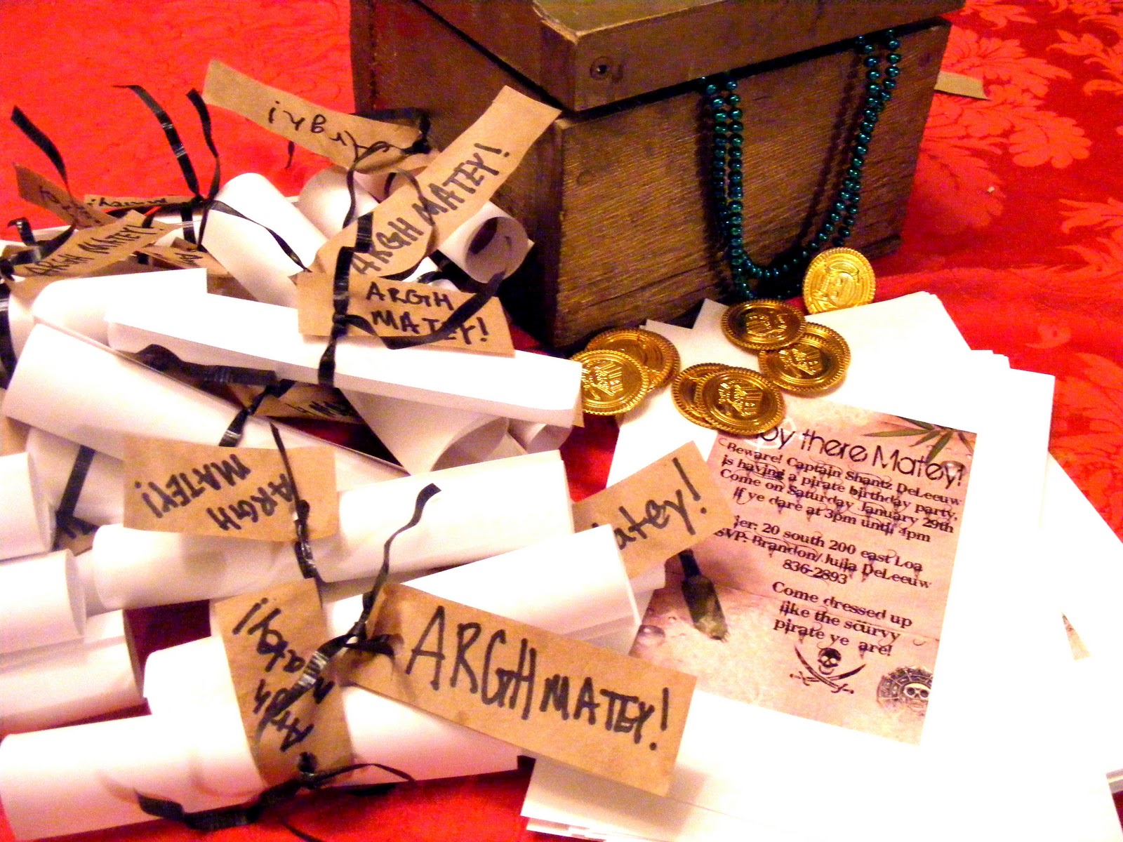 We made these fun birthday invitations for my five year old’s pirate themed birthday party. They were easy and fun to make so I thought I would make a printable version for you EMI readers to print off some for your selves and your next scurvy party.