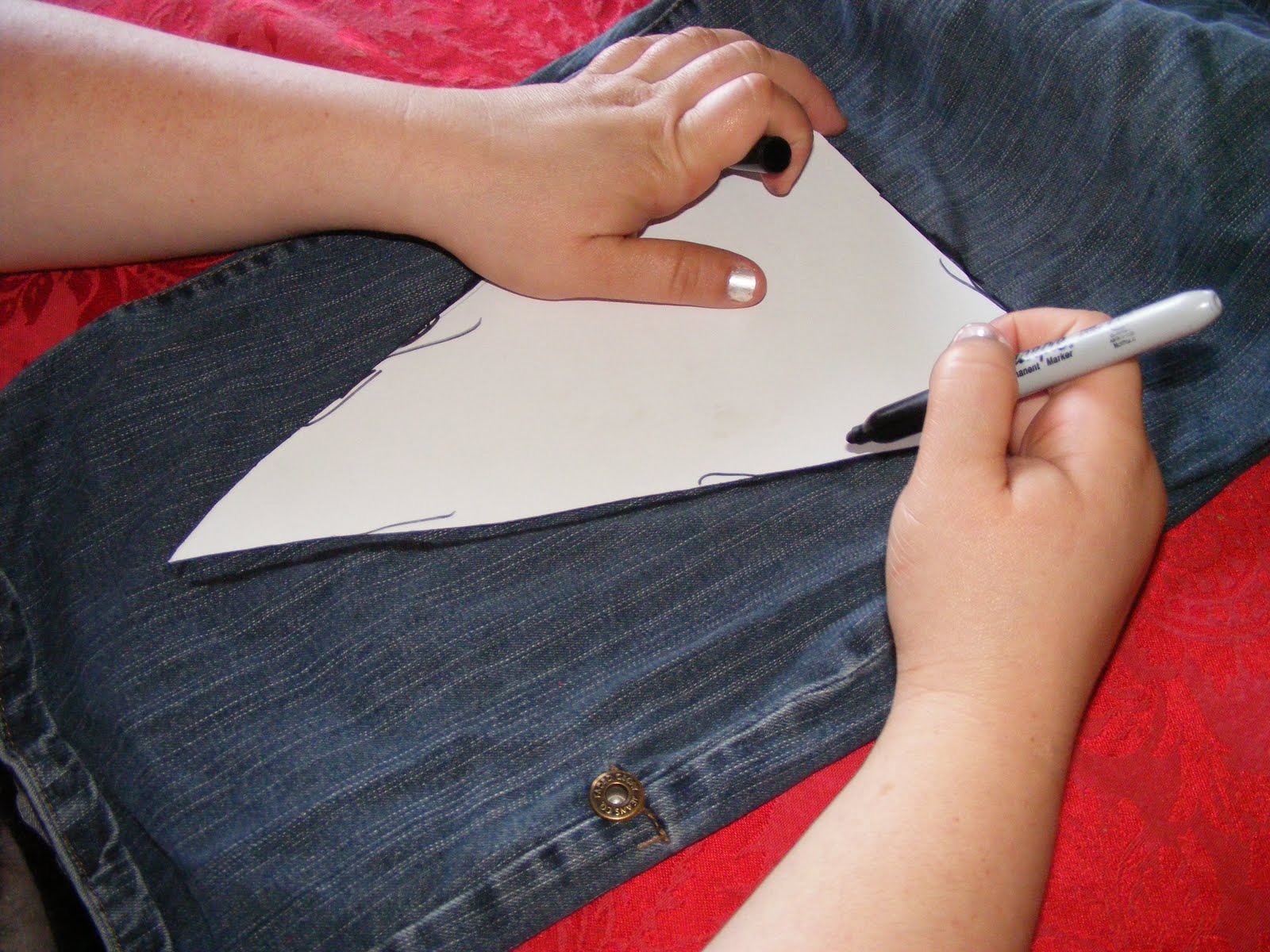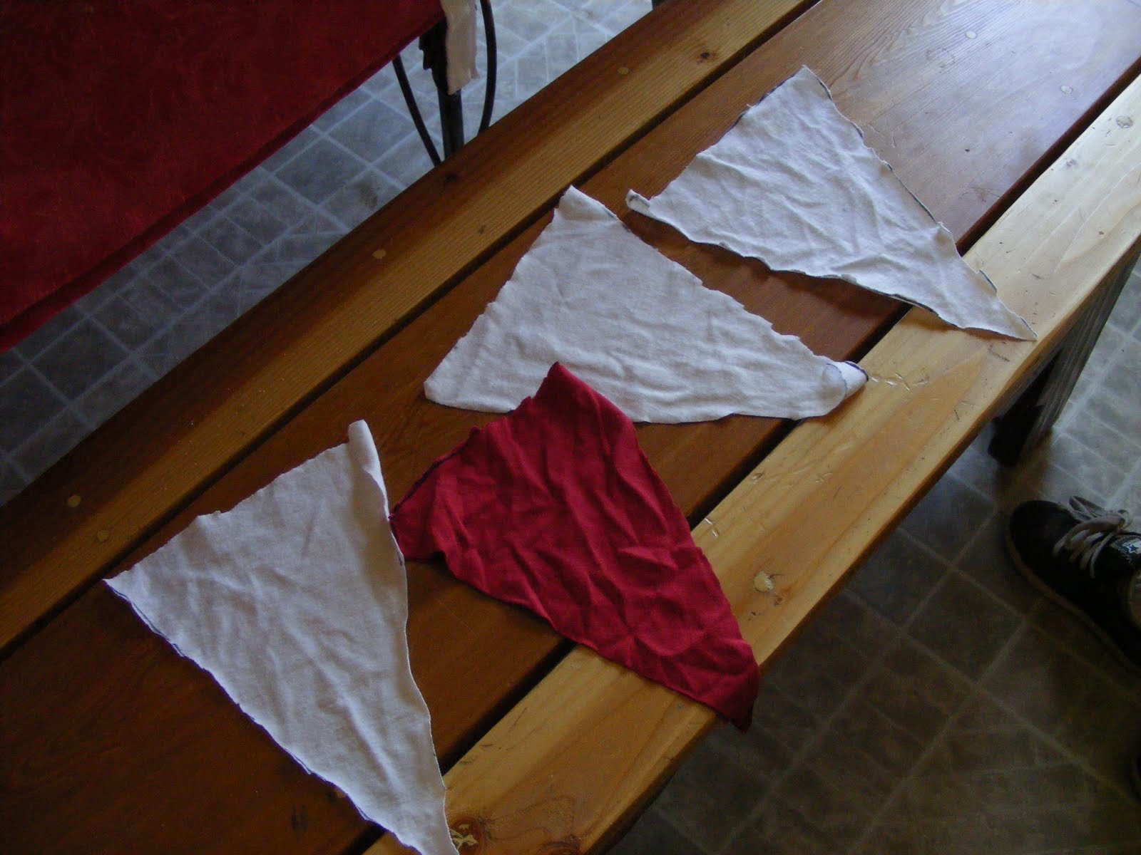 2. Your going to need to make 9 flags. Take the sheet of card stock paper and cut the sides off in an angle to make a paper length triangle template. Trace the template with a pencil on the yard of fabric. Continue to trace the template along your fabric by flipping the template from top to bottom so that you can reduce the waste of any excess fabric.