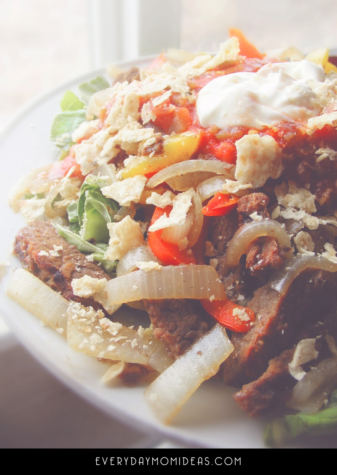 - Divide Fajita steak mixture in fourths. Add one portion to bed of lettuce. Top with 1/4 cup of salsa and 2 TBS of fat free sour cream.