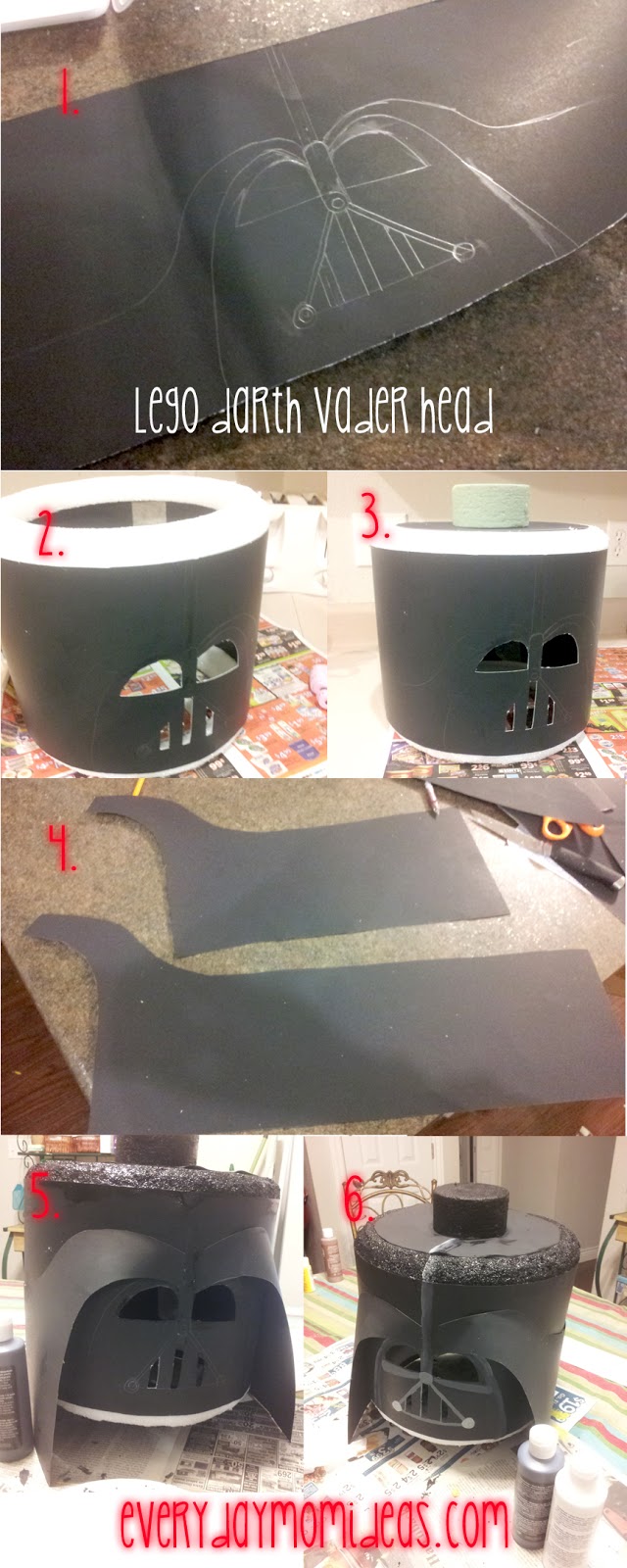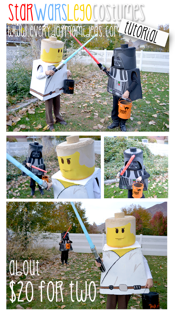 I don’t know about you but its all things Lego Star Wars with my seven and eight year old. And they have been begging me for moths to let them be Lego Skywalker and Lego Darth Vader for Halloween. And guess what… you can’t buy that costume anywhere, it doesn’t exist… in fact there wasn’t even a tutorial for how to make this costumes. So I was on my own. Thank goodness I am no stranger to cardboard, poster board and paint. Just call me the cardboard queen. These costumes took me about four hours to make and about twenty bucks all together. And they were a hit.