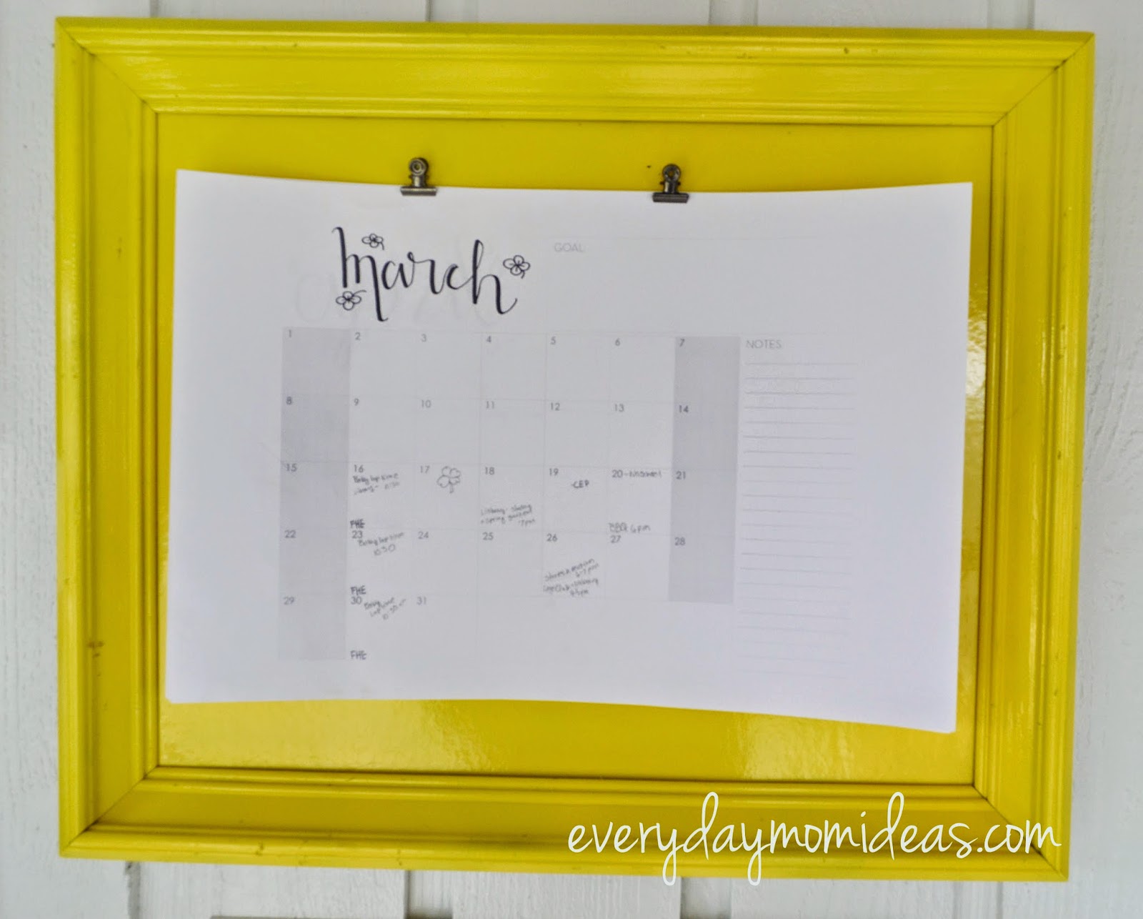 To make a simple and fast frame for your calendar just find one of those old looking framed fake paintings without the glass and spray paint the whole thing a fun bold color. Then you can add two clips, or clothes pins with some gorilla glue to hold up your calendar.