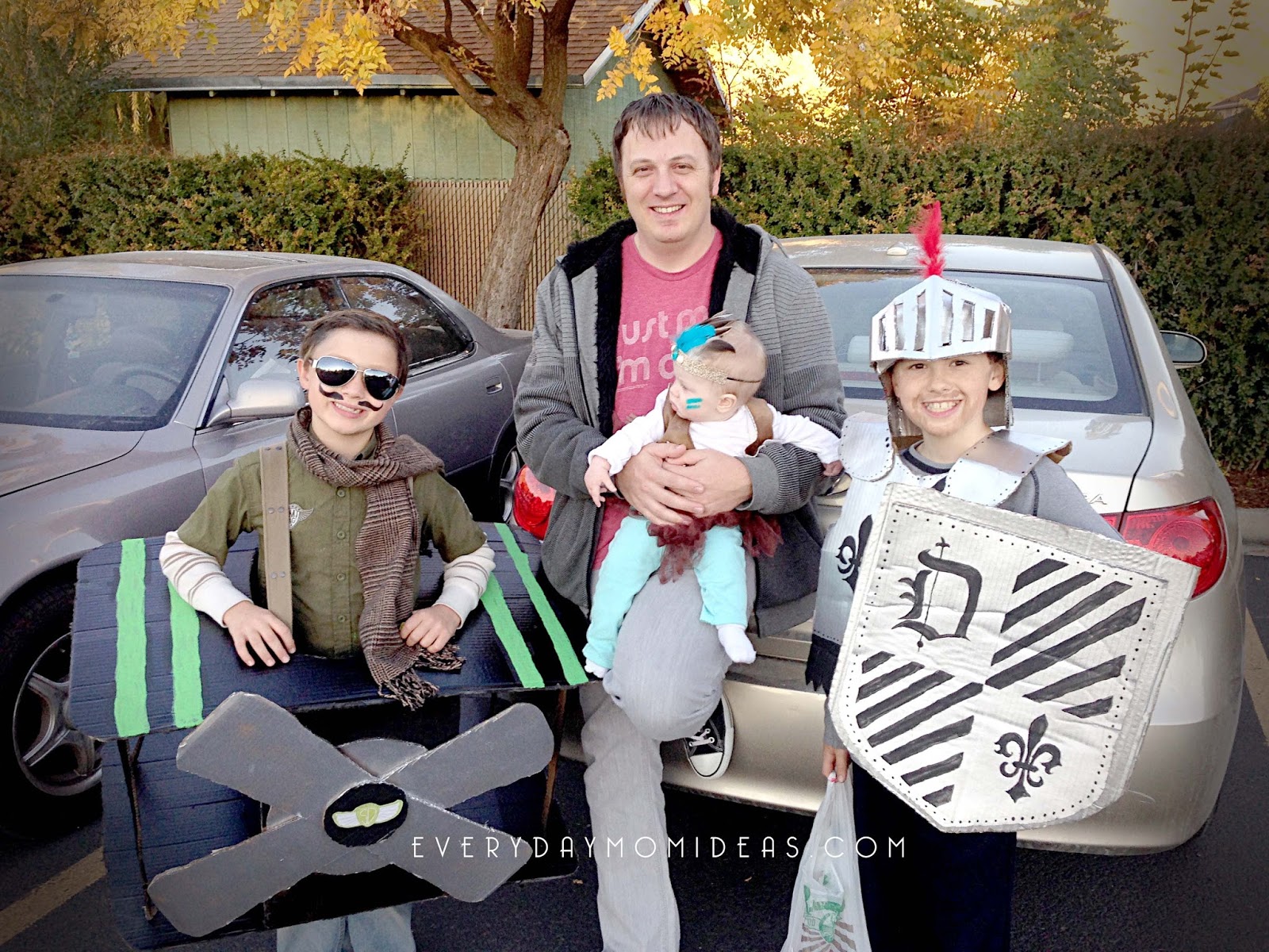 We kept this cardboard knight costume simple by cutting out basic shapes and using simple designs. This is a great costume if your on a budget or if you just want to make something extra special and custom made. This costume didn’t actually cost us a thing. We were able to find everything we needed with stuff we already had around the house.