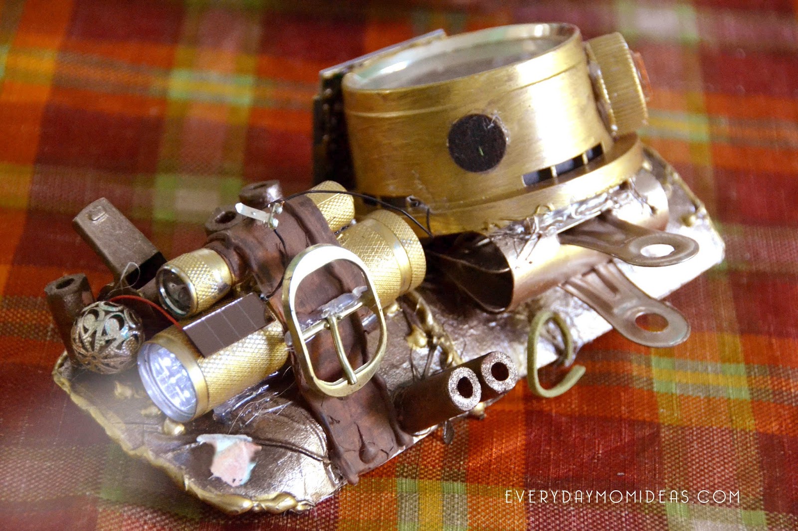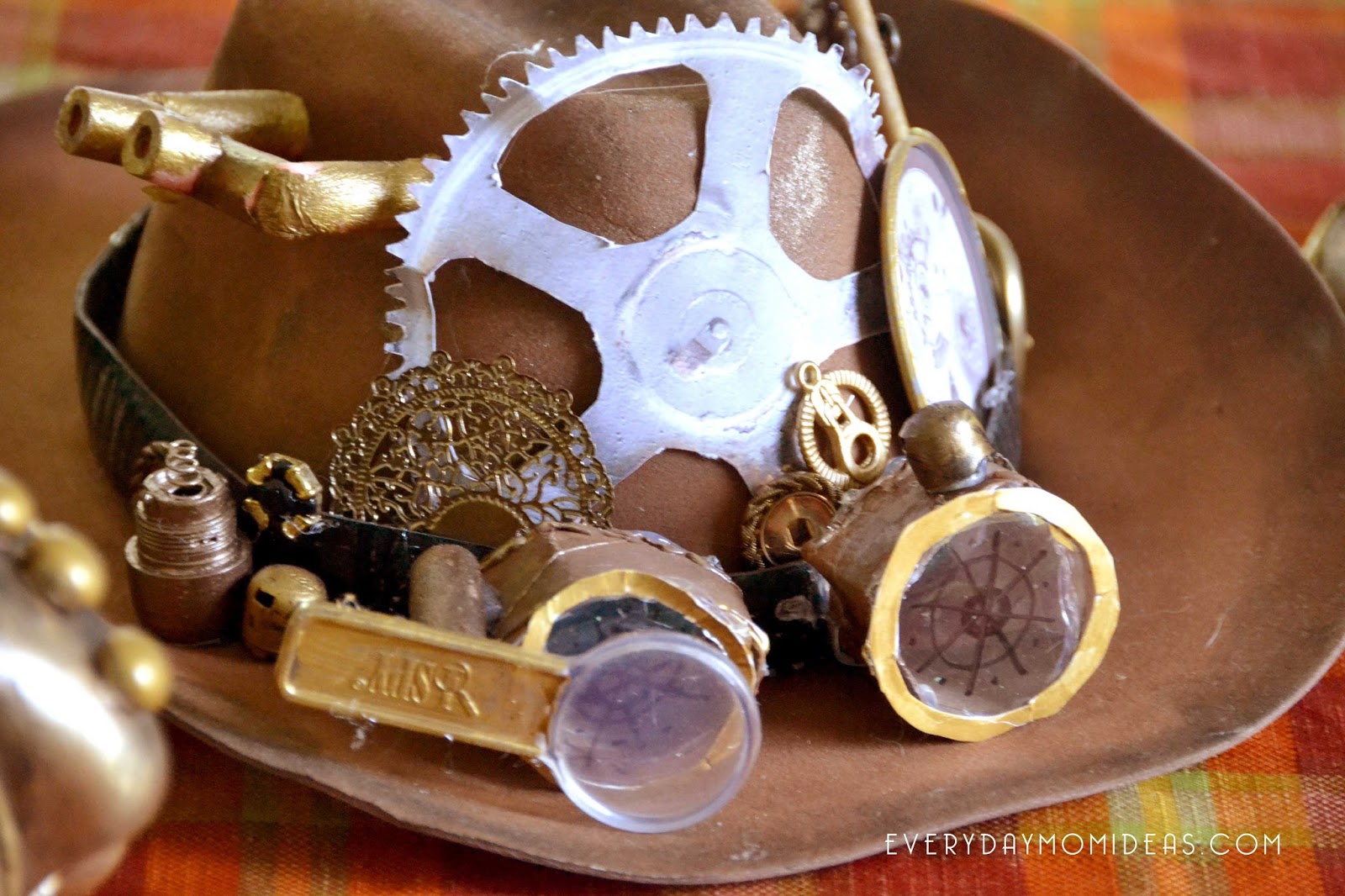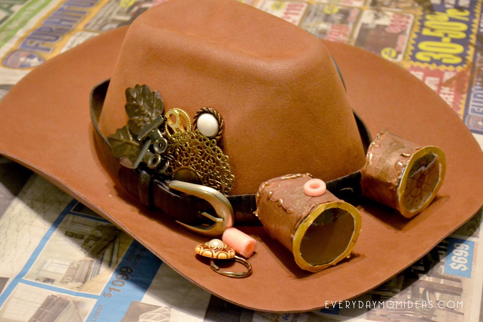 For the hat we bought at the dollar store we used an old kid belt and button and clips for the accessories. We used toilet paper rolls for the goggles and plastic from old containers for the lens. Nerf gun bullets come in very handy for making knobs, gears, pipes, and bolts. We also printed off some cogs for the hat and accessories.
