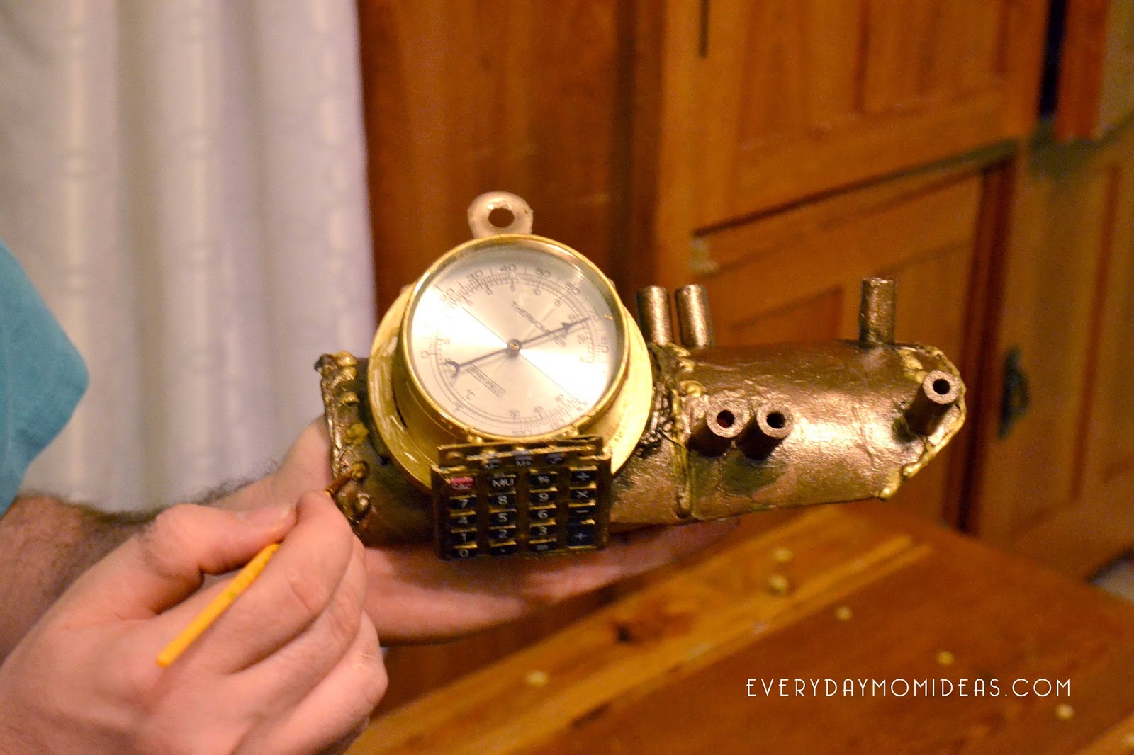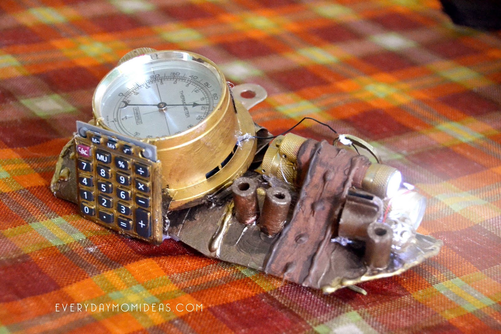 The Steampunk wristband was a really cool touch and doubled as a Halloween working Flashlight. The base was made with a leftover cardboard tube. We added the nerf gun foam bullets for pipes. An old calculator that didn’t work came in very handy. We took it apart and used different parts of it throughout the wristband. Then added flashlights and a whistle.