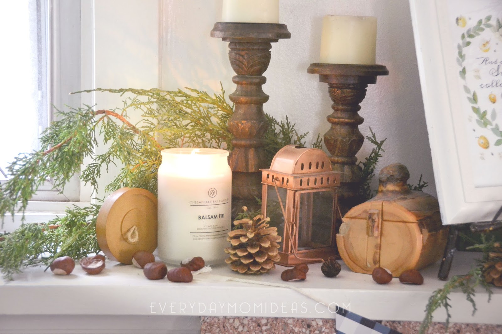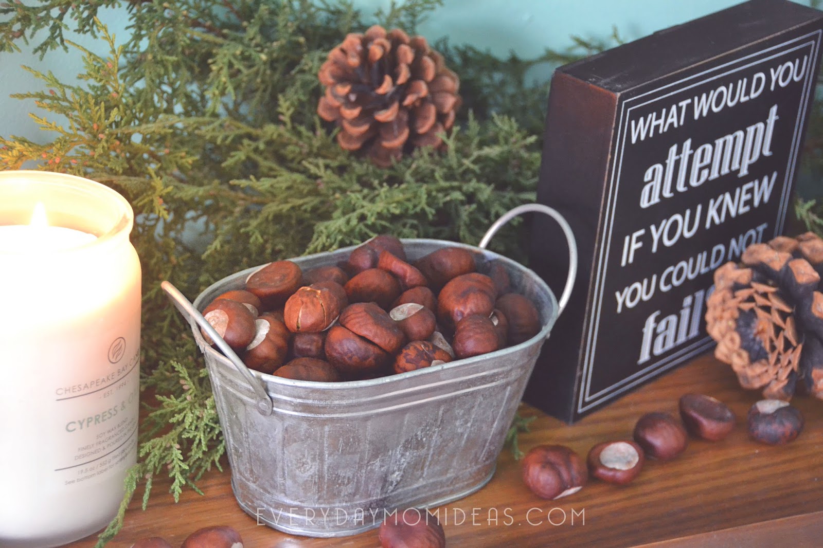 This authentic bungalow style mantle with its matching and original bookcases is the pride of our home and deserves to be decorated accordingly. It can be challenging to decorate with the past and the present in mind. That’s why I always try to mix a little old with a little new. For this years fall look I was inspired by The Heritage Collection by Chesapeake Bay Candle and by all the nature all over my yard. It all began with these chestnuts that dropped from our tree and was now in abundance all over our yard. Sounds like a nice problem to have but the sad thing about these chestnuts are they are NOT the edible kind. These pretty little deceptive beauties are completely useless… or are they. That’s when it dawned on me… I should decorate with them. This little experiment surpassed all my expectations and I am in love with the natural beauty these different elements add to our festive vibe in our home.