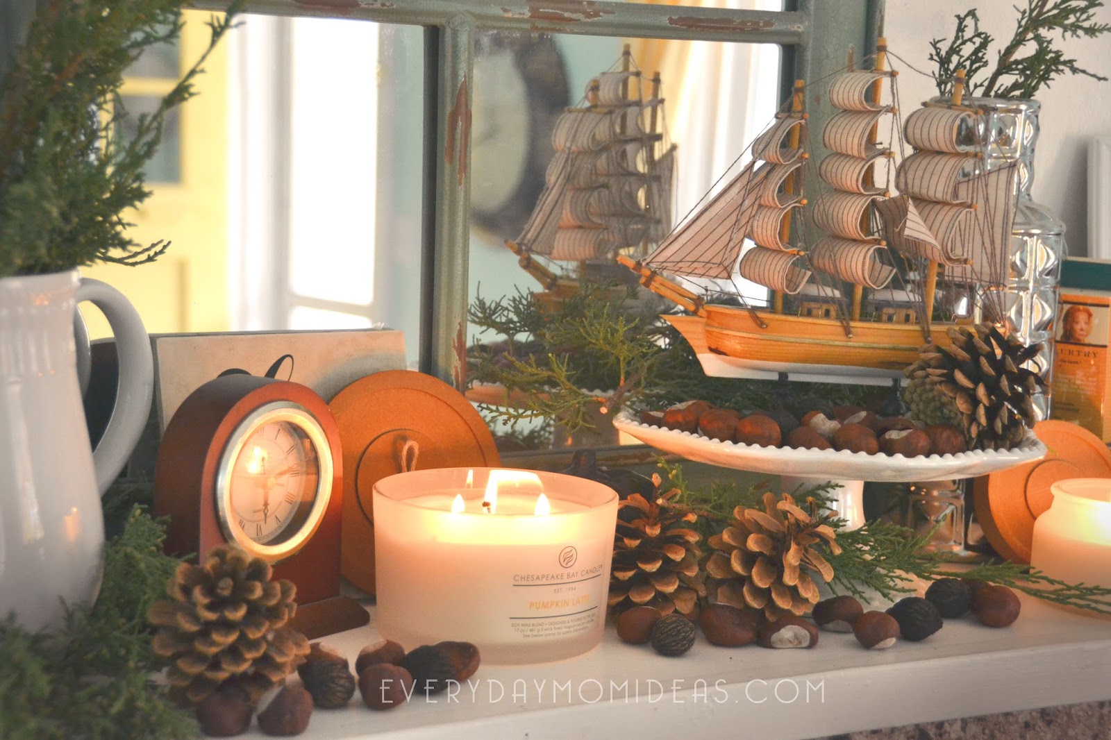 The Pumpkin Latte coffee table jar candle is the centerpiece for my bungalow fireplace mantle decor. I love this large triple wick candle because it lets off a bright glow and enough fragrance to fill the main floor of the house with its aroma of pumpkins, pralines, and pecans. Oh my! I’ve accessorized the Pumpkin Latte candle with some pinecones, chestnuts, black walnuts and of course a figurine of the Mayflower.