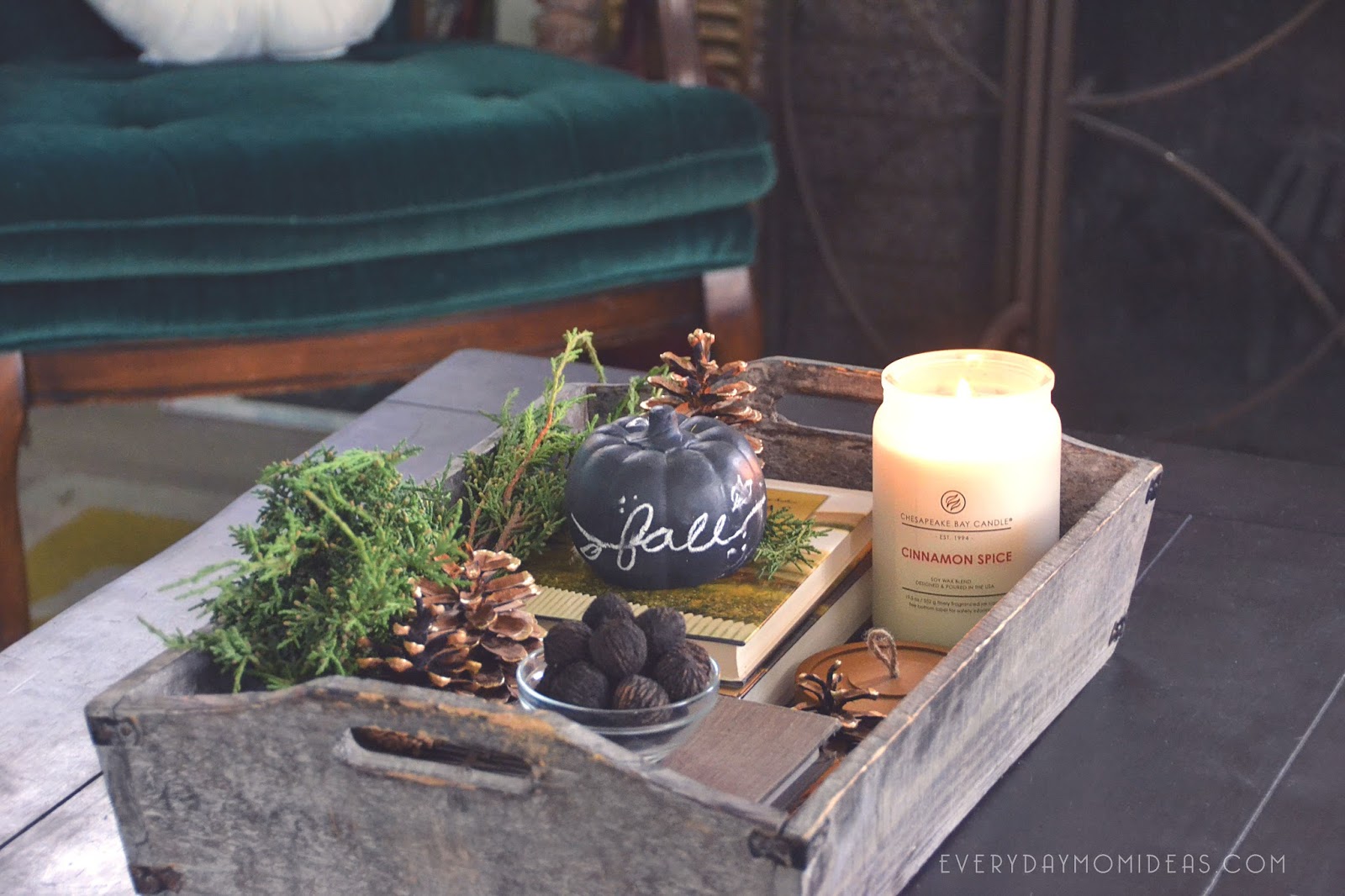 Right now I’ve decked my coffee table tray out with gold-tipped pine cones, rare black walnuts, cypress foliage, fall themed books and the Cinnamon Spice large jar candle from the Heritage Collection.