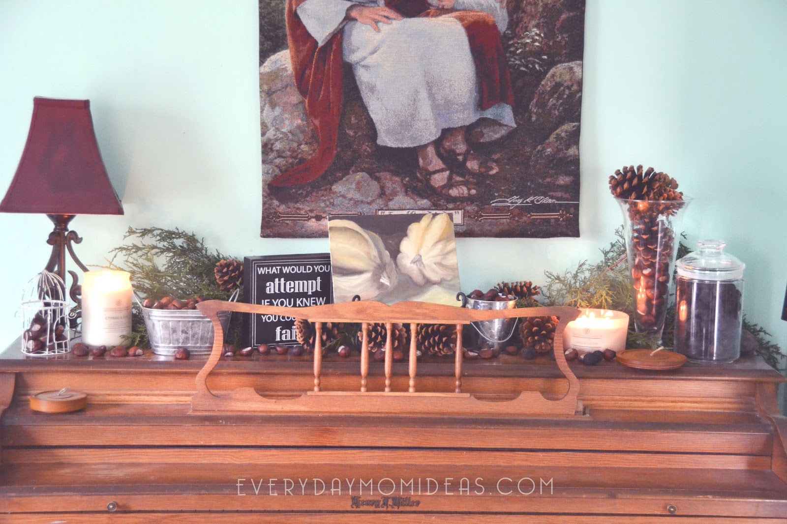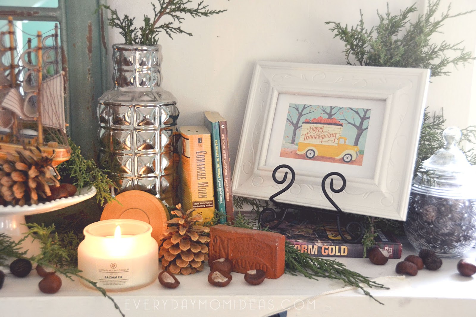 I love that this whole look can easily be transitioned over from Thanksgiving decor to Christmas decor. Remove the Mayflower and add a nativity and there you go. The Chesapeake Bay Candles really go with everything. I use them in just about every room in my old historic home and they only add to the warmth and decor. You will be amazed by the thoughtfulness put into every scent combination and craftsmanship and quality of the candle itself.