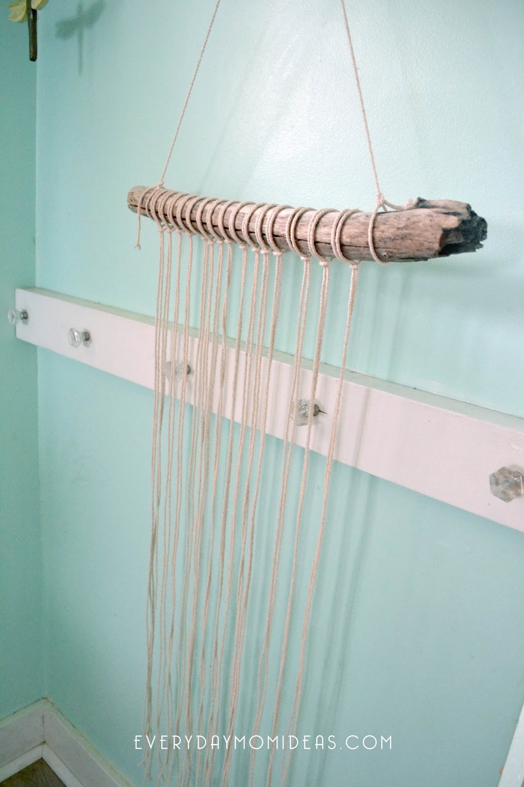 My wood branch is cut at 2 feet wide and I tied some macrame rope from one side to the other for hanging purposes. In order to work on this macrame project you will need to have it hanging up while you work on the knots.