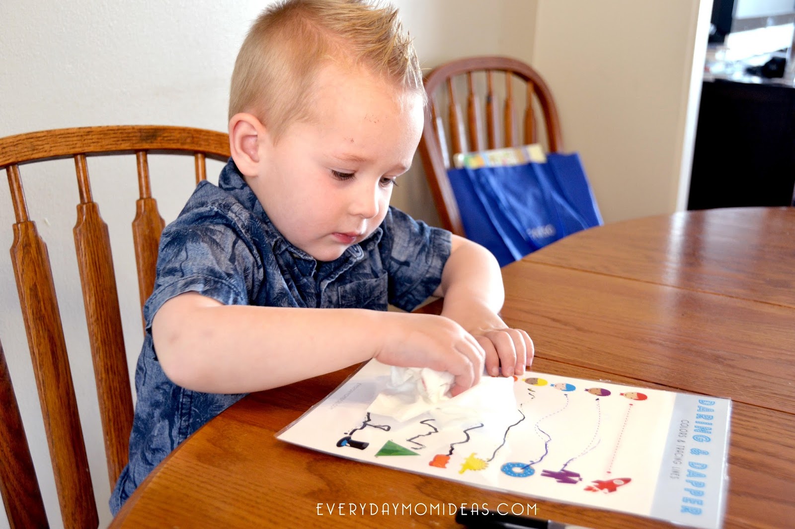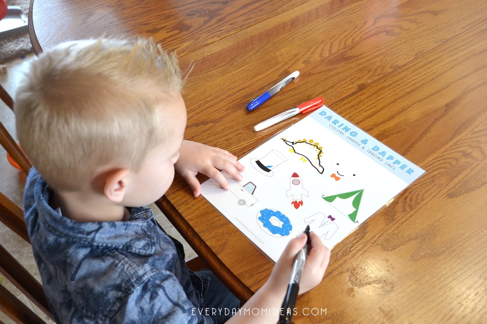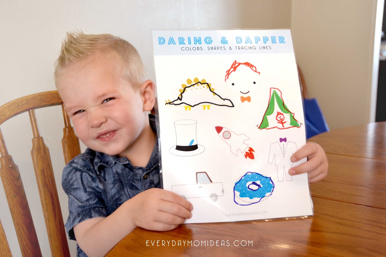 I recommend laminating this printable for extra usage and learning fun. I had mine laminated and found multi colored dry erase markers at my local dollar store to go along with each color and dotted line. The dry erase markers and laminated Daring & Dapper worksheet take away the stress of making mistakes for little ones so they can just enjoy the practice.