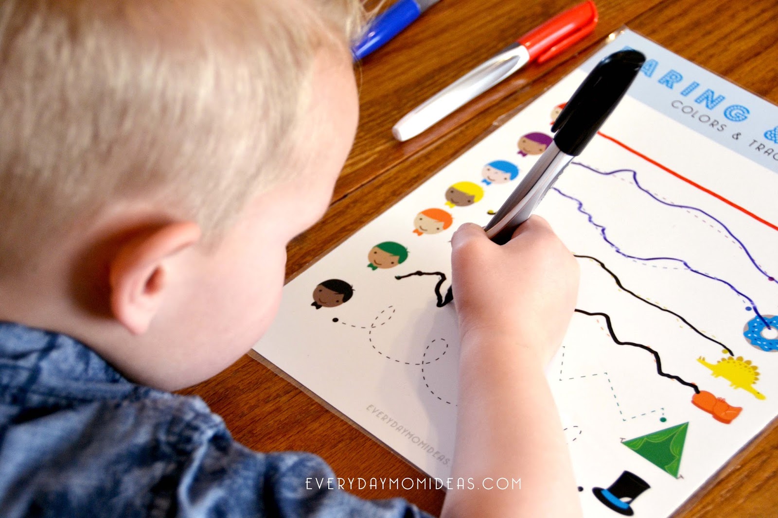 At first you may just want to stick with a black marker as they get used to following the dotted lines. Then add color markers later to the learning sessions to introduce colors. Or just do the line drawing side and work you way up to doing the drawing side after a few days or weeks. Just go at your child’s pace. No hurry keep it fun.