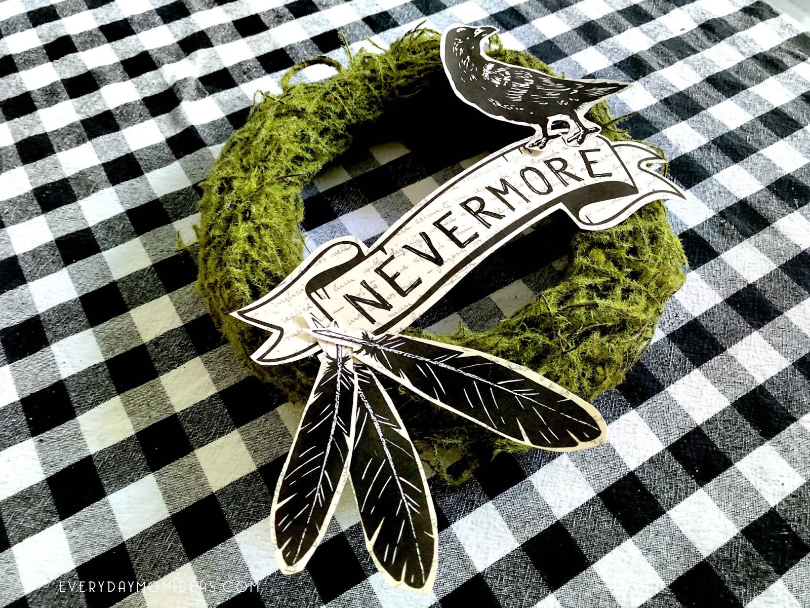 Edgar Allen Poe’s poem “The Raven” was the perfect inspiration for my Halloween decor wreath.The Raven is one of the most famous poems of all time. Edgar Allen Poe’s poem is quite unsettling and takes place late at night when a young man receives a most disturbing visitor, a raven named Nevermore. The visit from the raven eventually leaves the young man crippled on the floor, going insane from his own painful loss and thoughts while the raven lures overhead with his cruel eyes.