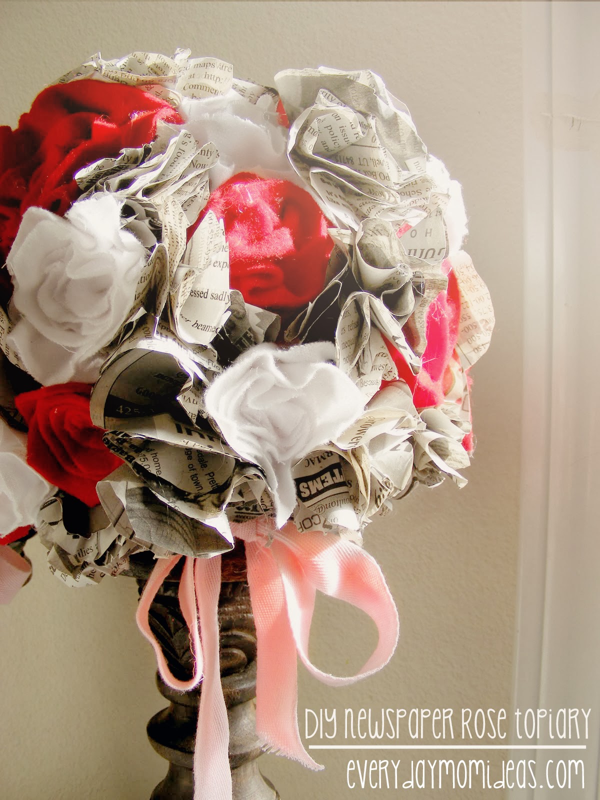Here is a great craft to make just in time for this romantic holiday. It has an elegant look to it, and can be used year after year. I really like mixing in the different materials. My little boys even helped cut out the circles for the newspaper rosettes.
