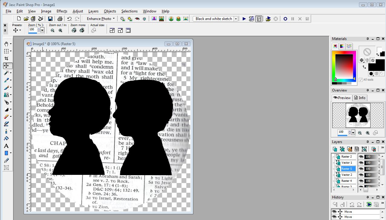 2. Once you have your silhouettes made, open up a new image size : 1.75 inches by 1.75 inches. add your silhouette images here and you can add any background you want. (Tip: A newspaper or any kind of text looks great. You can always just scan in a piece of newspaper to your computer and use that.)