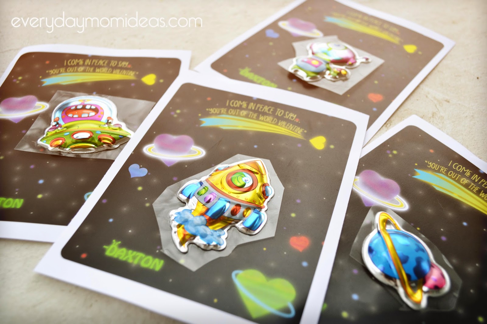 These were so fun to make for my third grader! We found these fun 3D stickers at the dollar store for 16 a pack and only had to spend $2 on his valentine cards. My nine year old just loves the heart shaped planets and that I personalized his with his name.