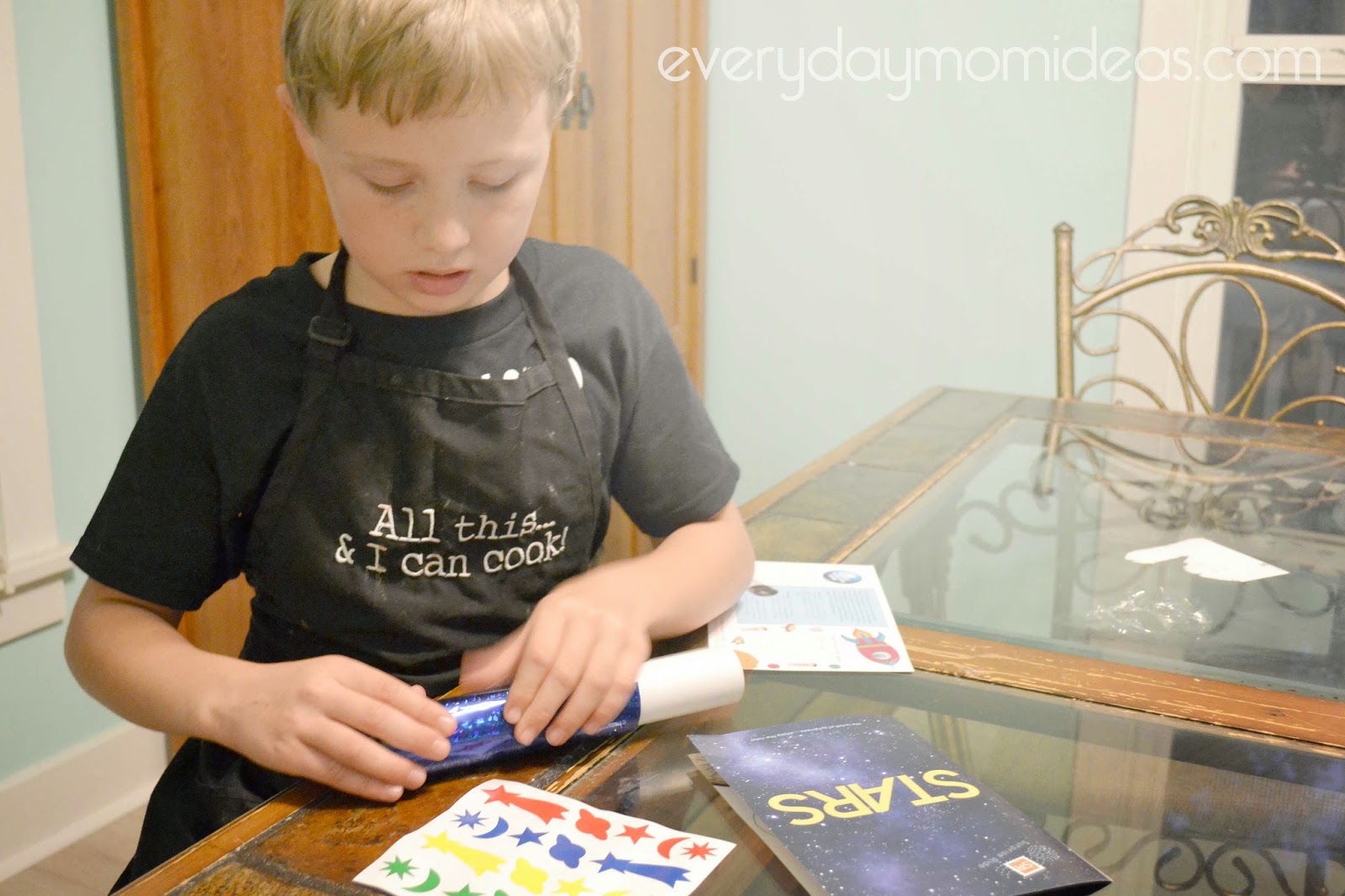 And here is my eight year old with the book about stars and decorating the telescope. The instructions are really well thought out and are nice and simple for my kids to follow all on their own. They just want to be so independent at this age.