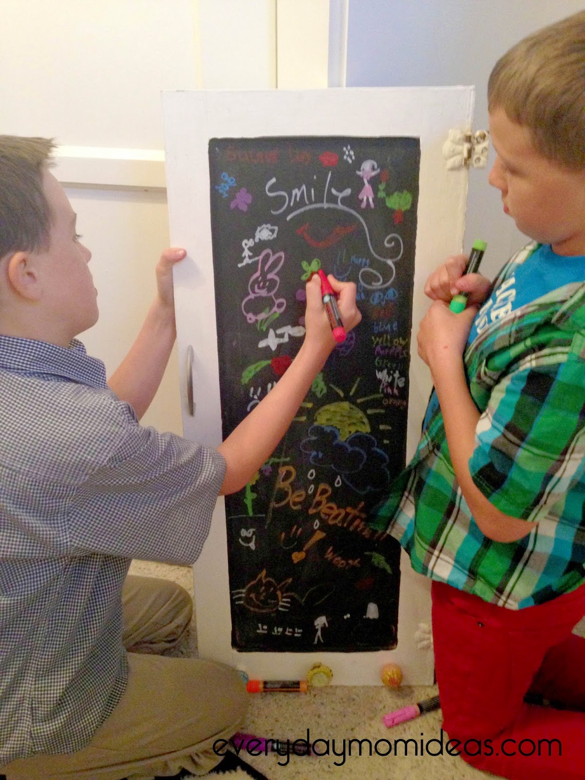 I just let my boys go to town on this old cupboard door we revamped into a chalkboard. The colors are so much more richer with these markers than regular chalk. Very fun!