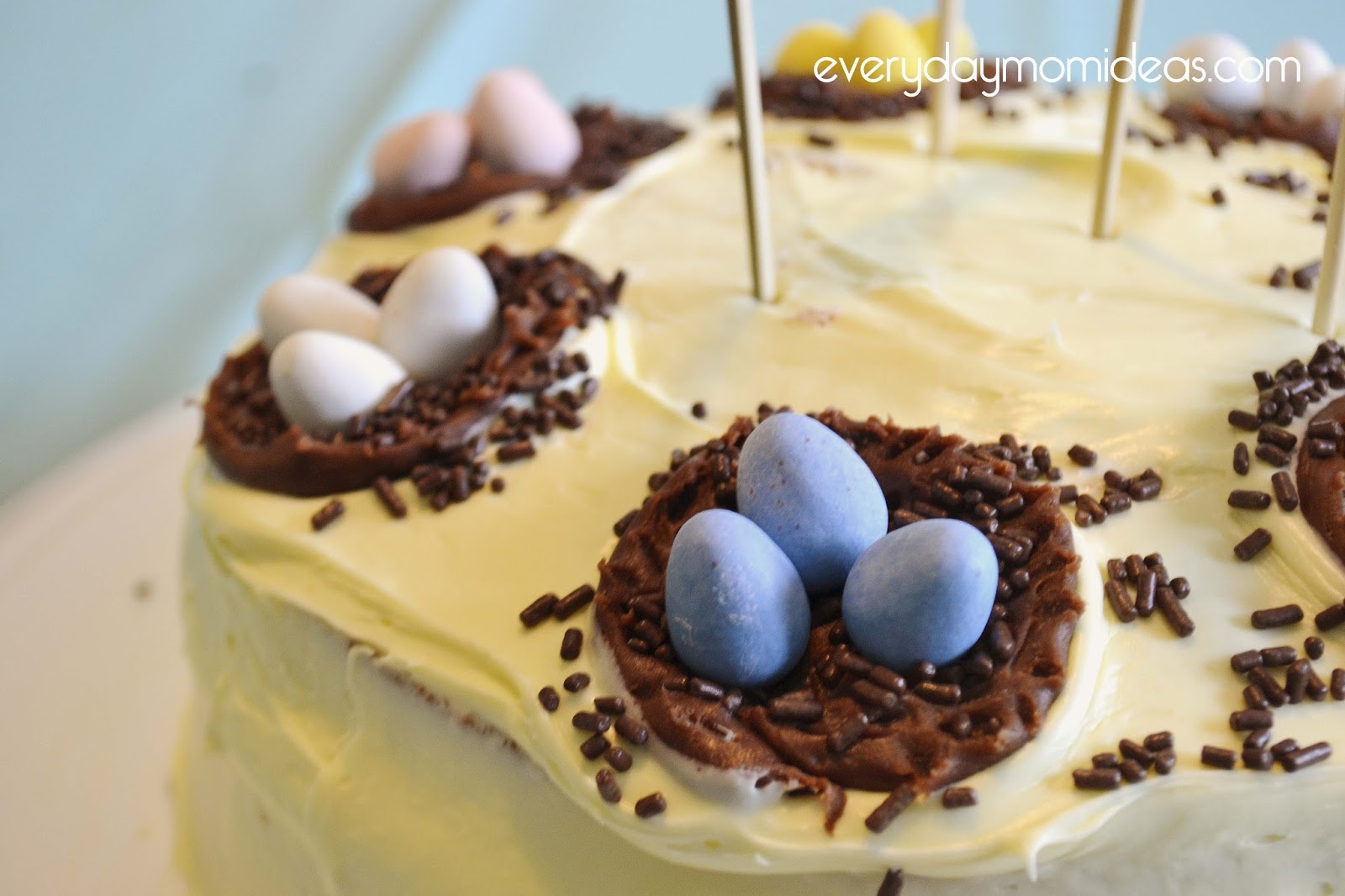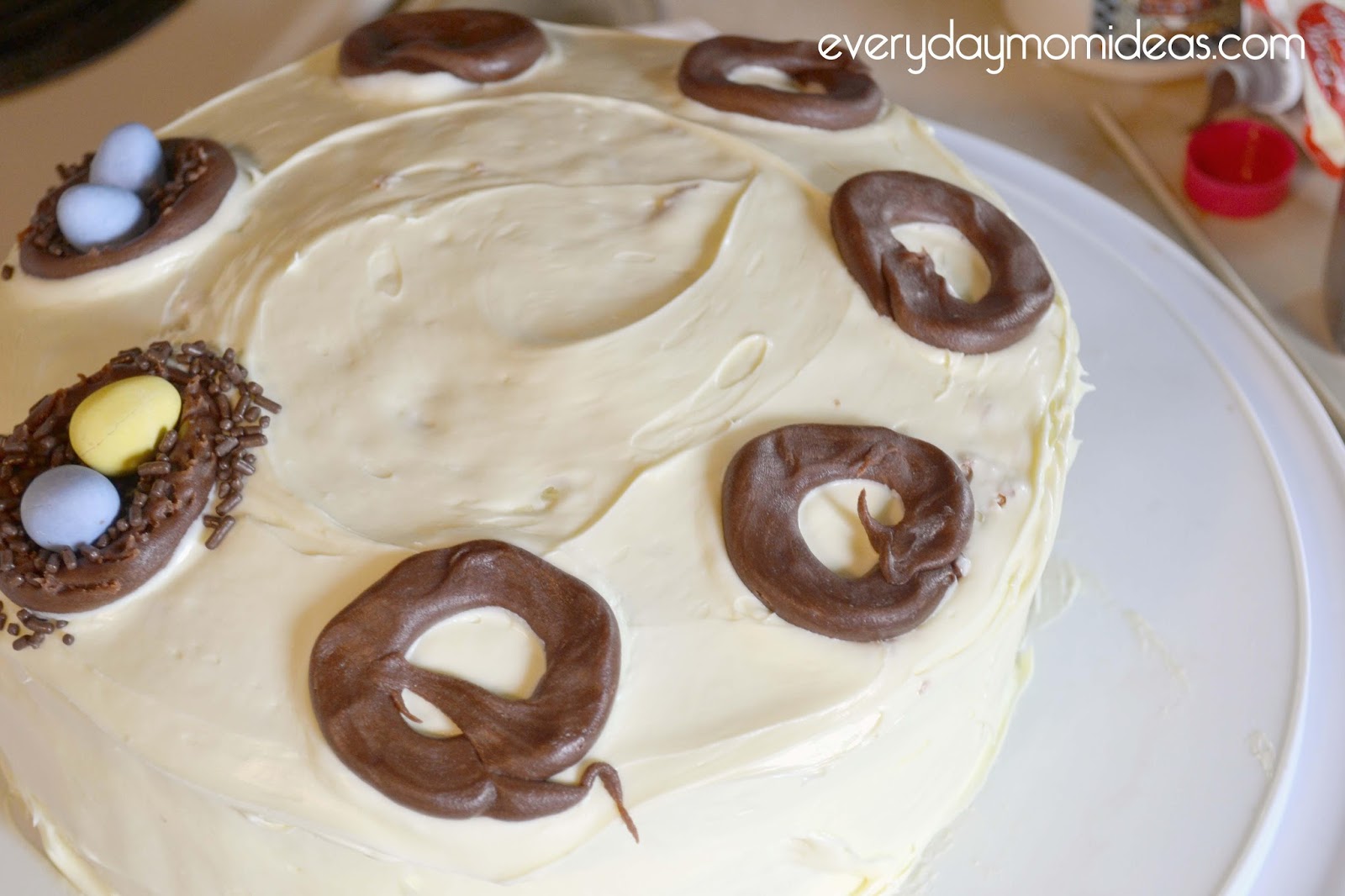 1. Make and frost your favorite cake for the occasion. Then you want to first start with making your little nest. To do that just squeeze out round circles with the chocolate fronting in a tube to form the nest.