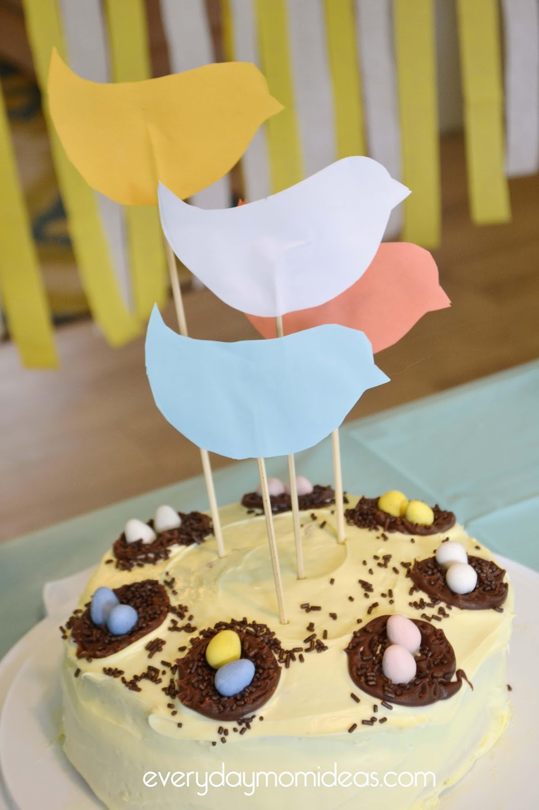 I came up with this sweet little birdy cake for my baby girls first birthday and it was a hit. Plus no need for yucky fondant for this cake.
