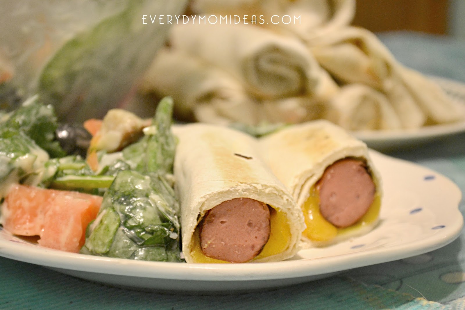 2. Place polish sausage and cheese slices in middle of tortilla. Add a strip of honey mustard the length of the sausage. Now you can roll it all up burrito style.