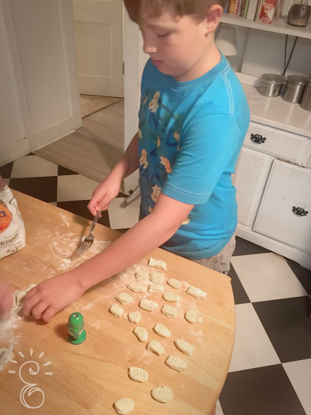 Above is my handsome ten year old helper. He made sure all the gnocchi had pretty little fork marks on top. I always have my kids with me in the kitchen. The best way to teach kids how to cook is to have them cook with you. It may take a little longer but I am teaching my kids important life skills that will last forever, plus I have the added bonus of making memories with them at the same time.
