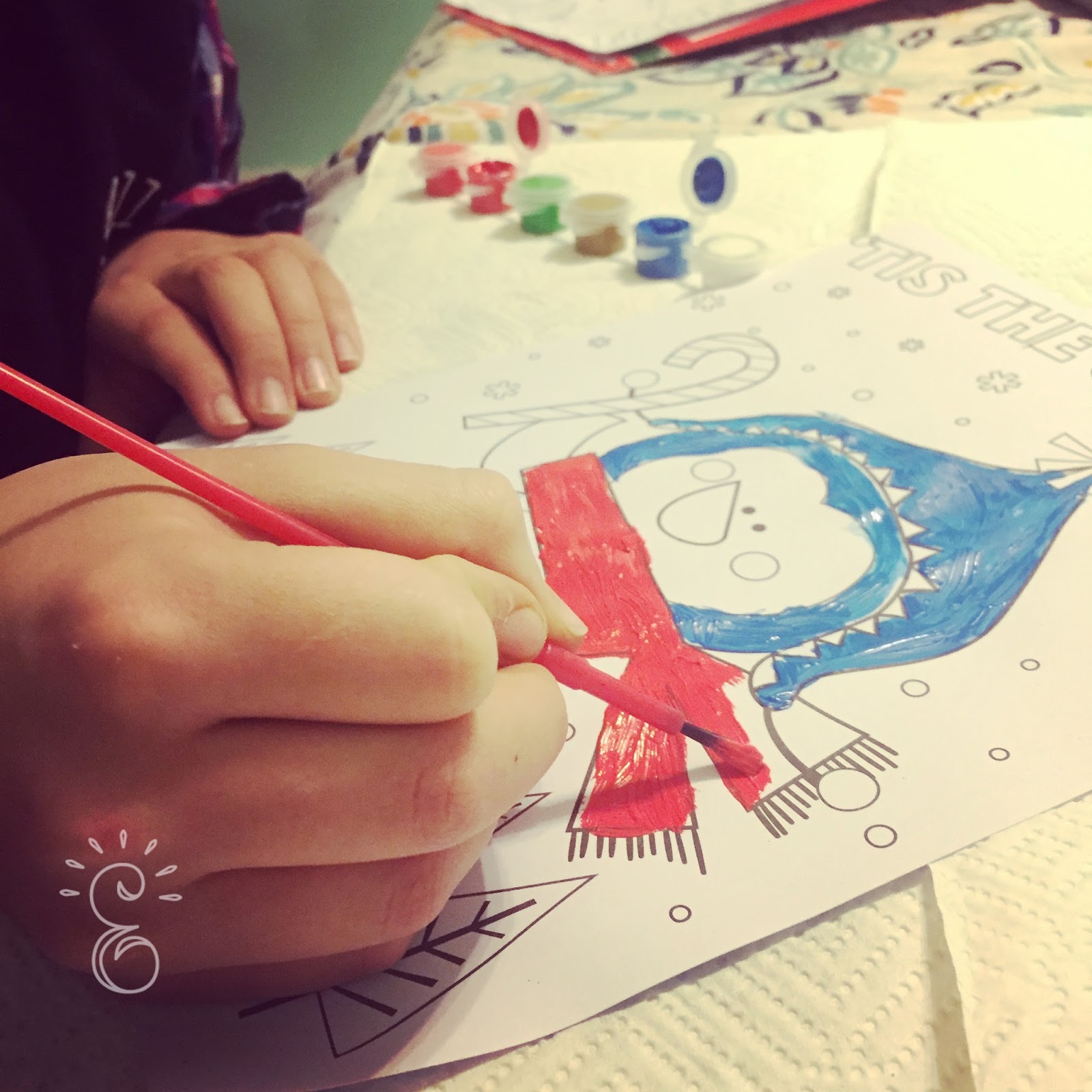 The kids got these cute little water coloring kits in their stockings and I thought it would also make a great little activity that both the toddler and the big boys would enjoy. While they painted I threw some pizza in the oven for dinner.