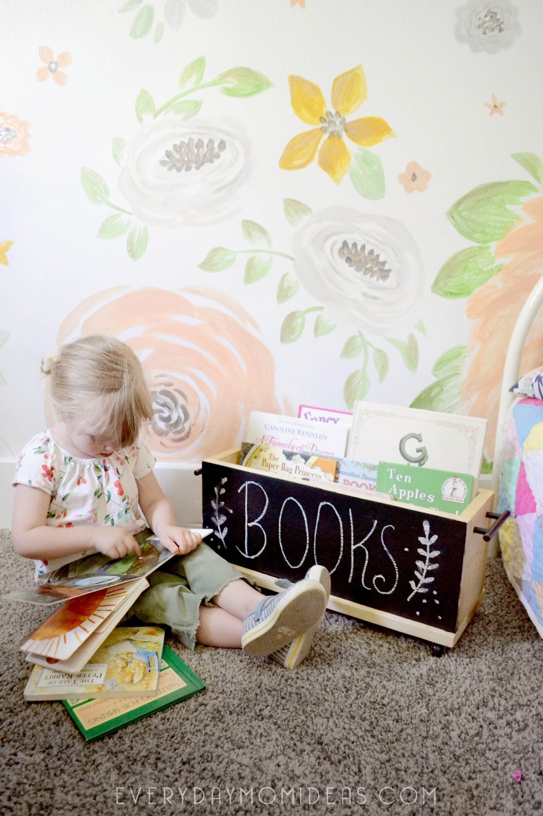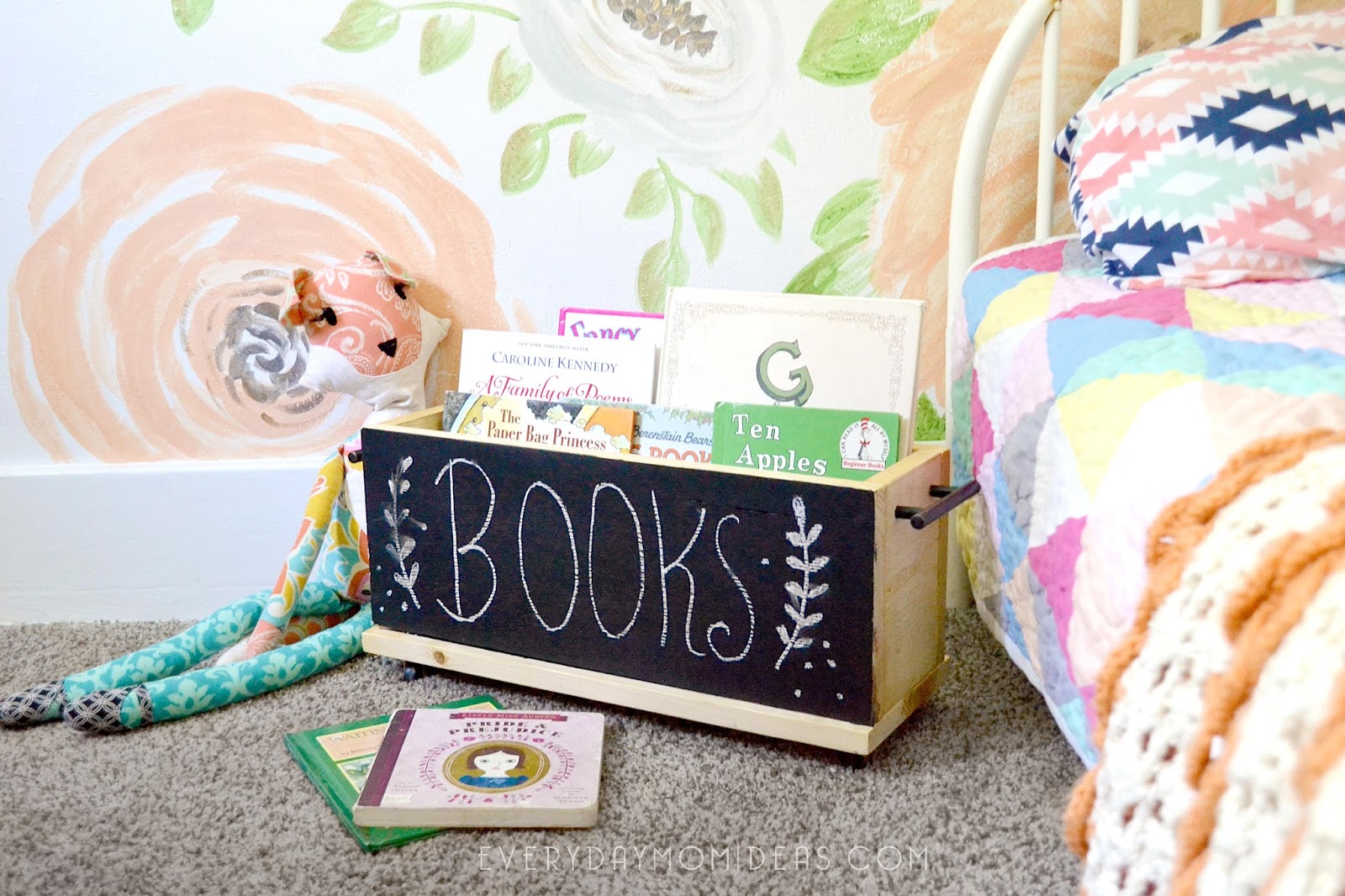 This chalkboard book box really is a nice addition in our home no matter where it ends up. I think it adds a modern touch to her Hand Painted Floral Bedroom Design and easily traditions to the living room or even the Tree House. Im amazed at how this simple design goes with so much. I plan on making many more Chalkboard Book Organizers to come for other cute storage solutions.