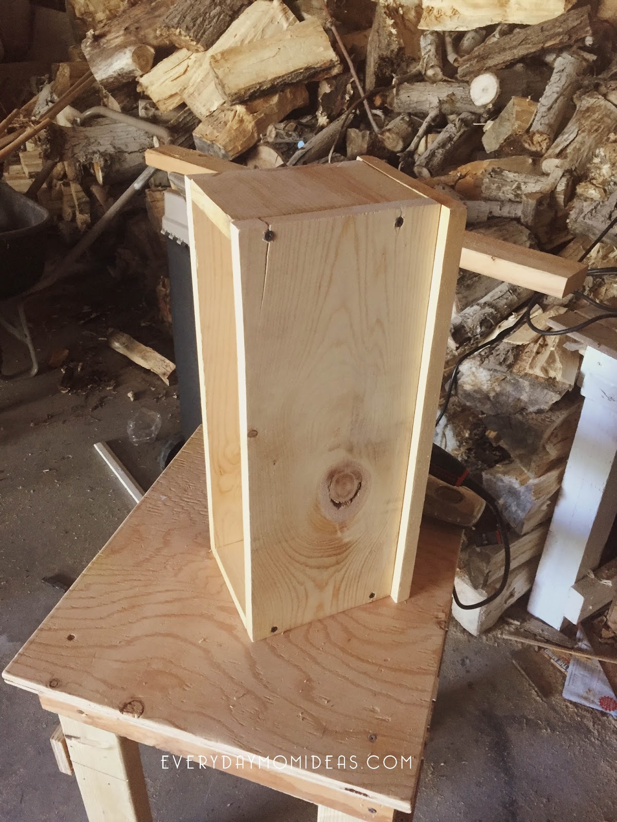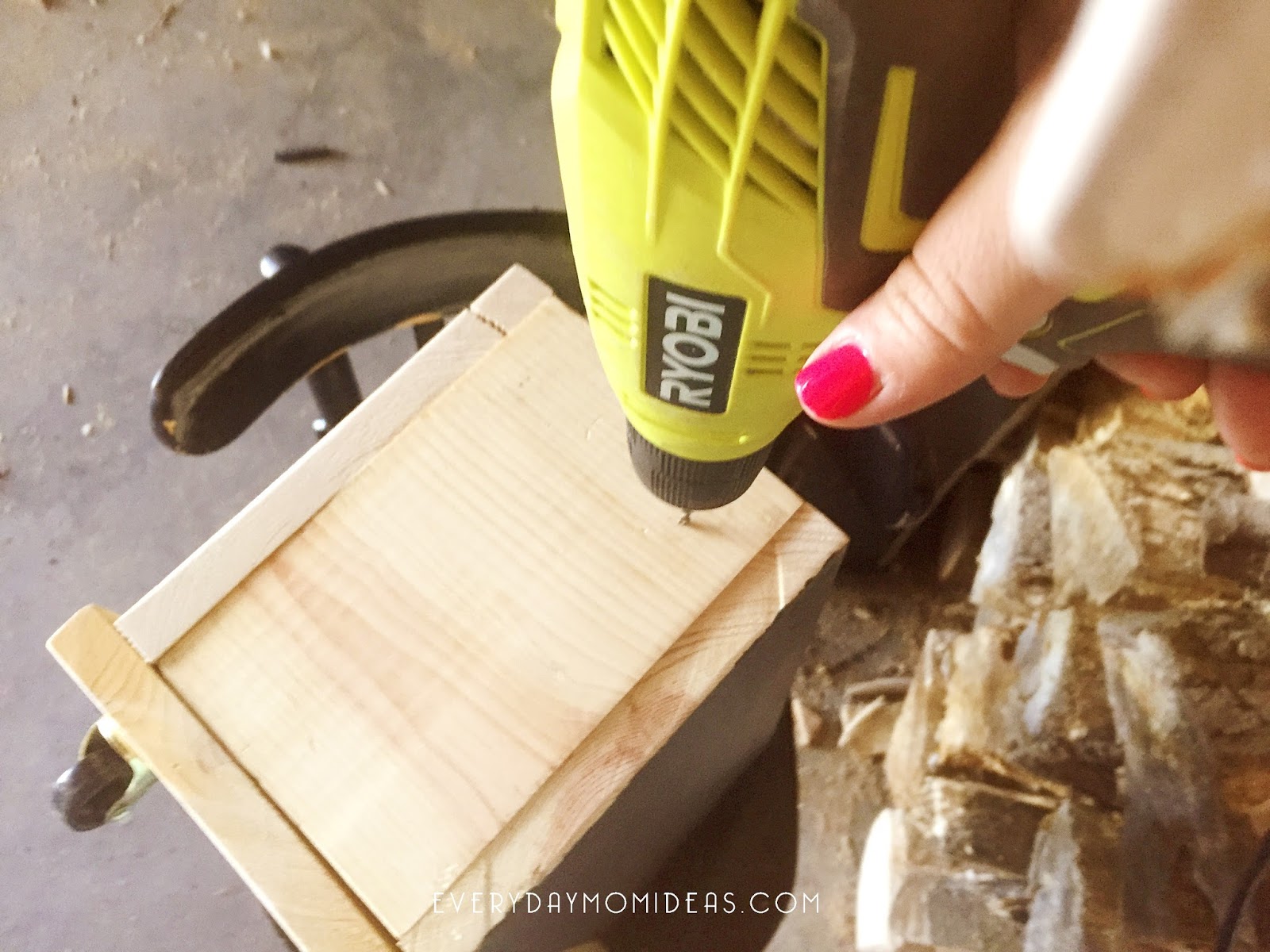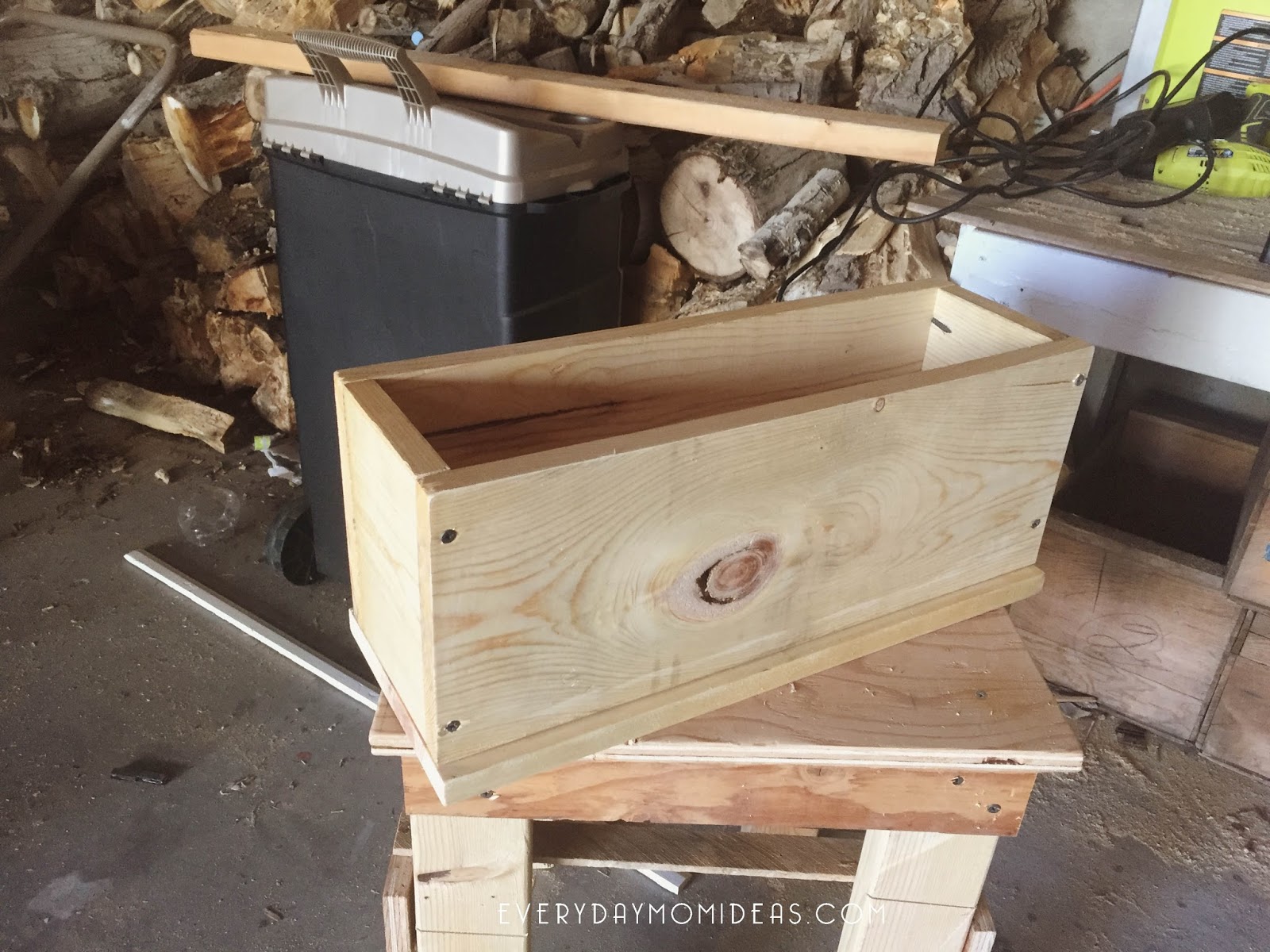 2. To avoid splitting your wood like I did the the picture above. Drill holes first and/or try to make sure you don’t drill too close to the edge and drill the screw down too far leading to cracking a breaking of the wood piece. Once all four sides are assembled you can attache the bottom. Lay your wood box on its side so that you can have an even little lip on both sides where the bottom wood piece sticks out just a little bit.