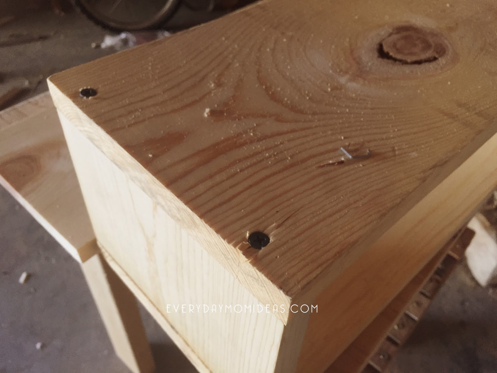 1. After you have made your board cuts using a chop saw or band saw with the measurements above. Its time to get assembling! Yay! You can secure the four sides together easily using 6×1 screws in each corner like the photo above. Placing the smaller 4 3/4 inch side pieces inside the two larger pieces of wood.