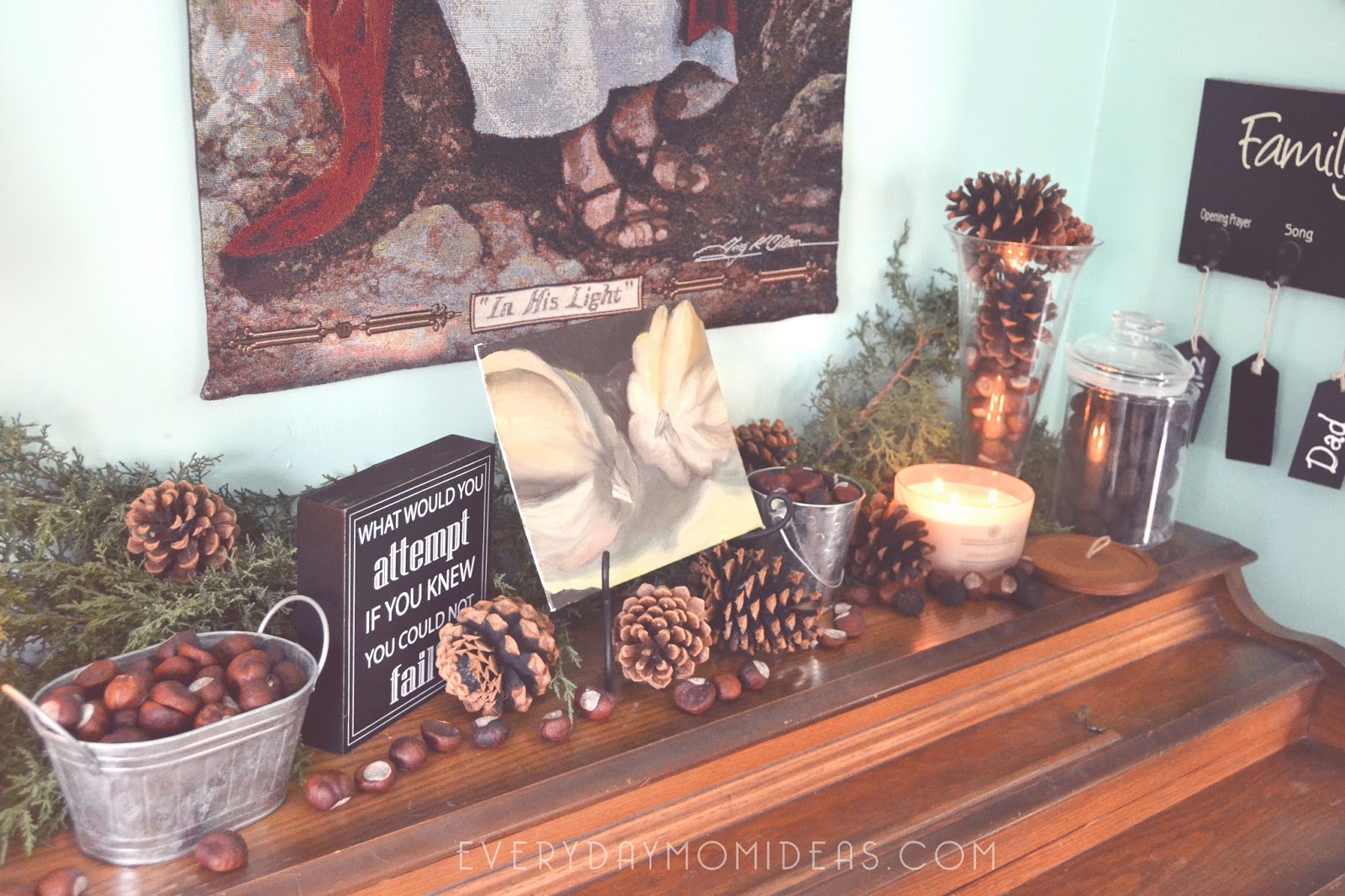 This authentic bungalow style mantle with its matching and original bookcases is the pride of our home and deserves to be decorated accordingly. It can be challenging to decorate with the past and the present in mind. That’s why I always try to mix a little old with a little new. For this years fall look I was inspired by The Heritage Collection by Chesapeake Bay Candle and by all the nature all over my yard. It all began with these chestnuts that dropped from our tree and was now in abundance all over our yard. Sounds like a nice problem to have but the sad thing about these chestnuts are they are NOT the edible kind. These pretty little deceptive beauties are completely useless… or are they. That’s when it dawned on me… I should decorate with them. This little experiment surpassed all my expectations and I am in love with the natural beauty these different elements add to our festive vibe in our home.
