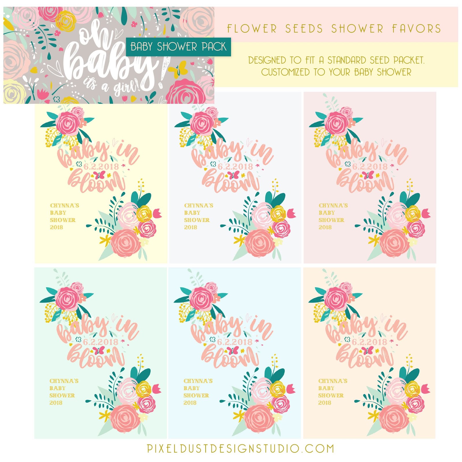 For the baby shower favors I designed these Baby In Bloom seed packet labels with the date of the shower and custom event title. These are about the size of a standard flower seed packet and comes in a rainbow of pastel colored backgrounds to make the seed packets feel a little more special and individualized. I chose not to make a full seed packet jacket because I wanted the guest to get to pick what flowers they would like to take home and plant.