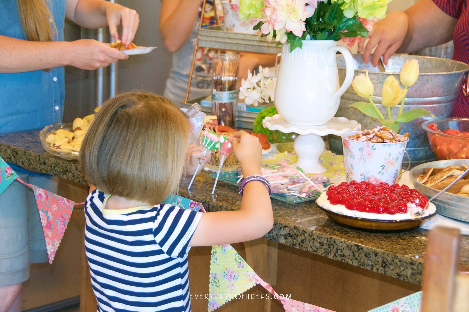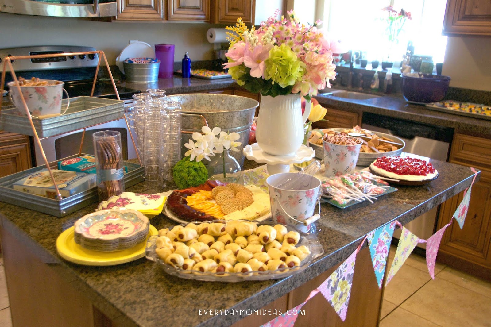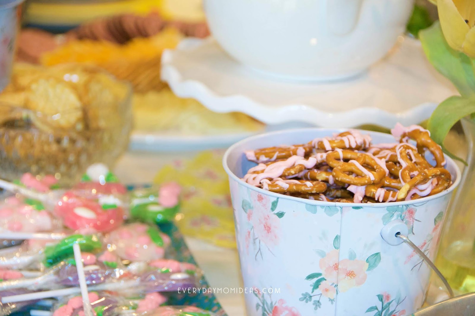 The food was amazing!!! My sister in-law and her mom took care of the food portion of the event. Im just in love with these tea party suckers she found and the floral paper plates and napkins are to die for. For the centerpiece we used a small cake stand, a white flower vase and the left over dollar store flowers. Since the shower was in the middle of the afternoon we did finger foods and snacks.