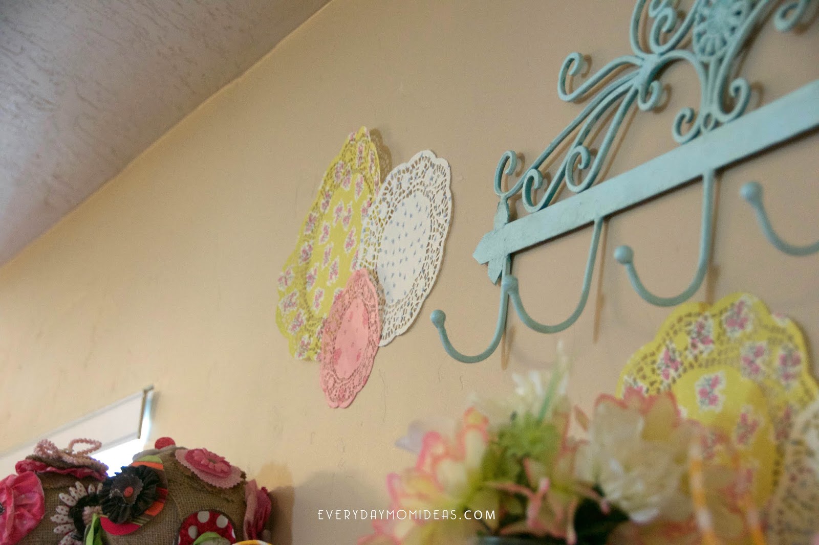 Floral Fabric Remnants: I was able to find a few pieces of floral fabric from a shifts store for fifty cents each. If you are a sewer you probably have lots of fabric leftovers you can use. Also these paper doilies come in large paper packs of 24 and can be used anywhere and everywhere. We put them all over the walls in fun patterns and used them under various dishes.