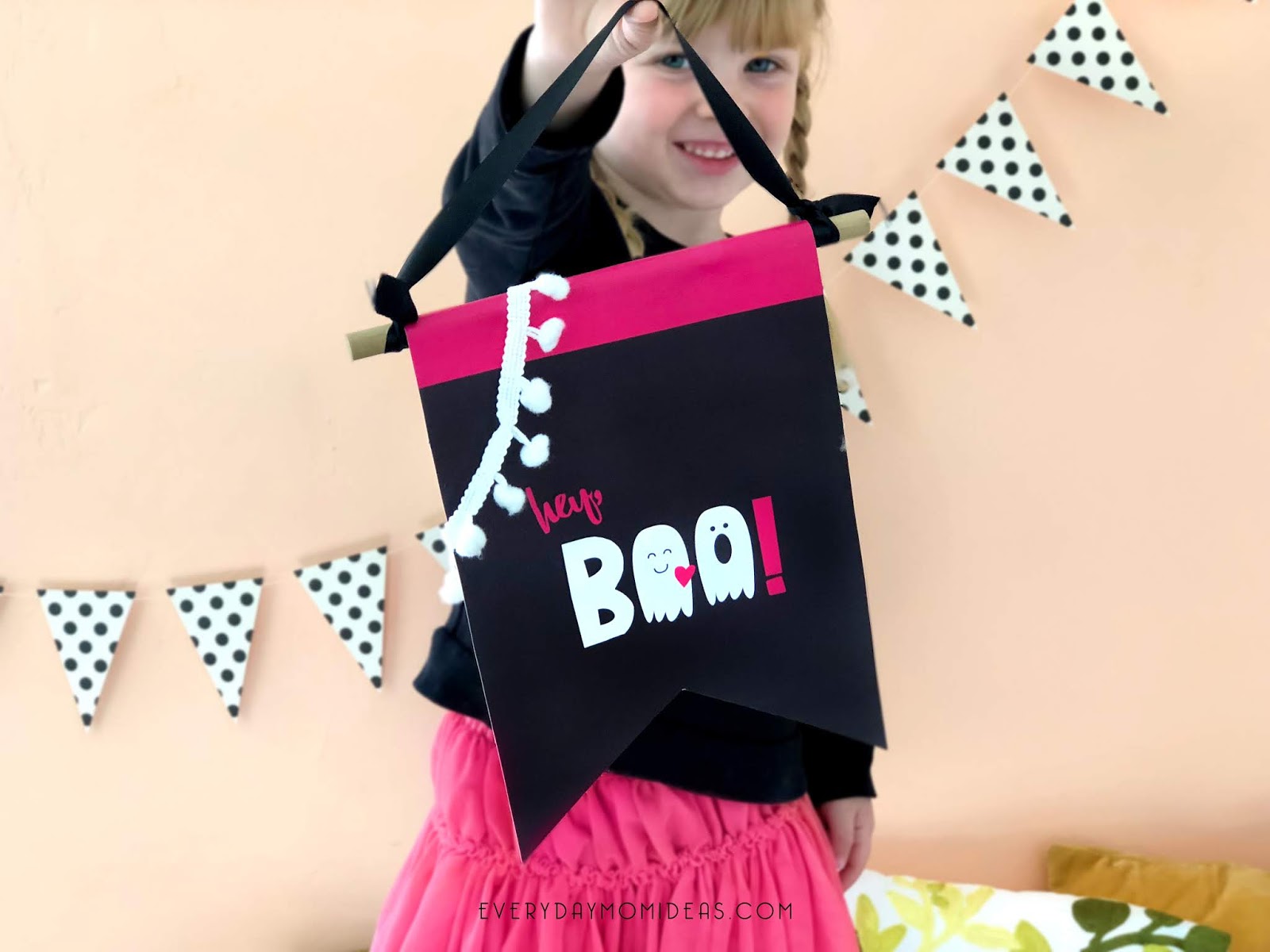 To turn this into a craft just print and cutout. Glue onto a wooden dowel cut at 10 inch length. Than add some string or ribbon to hang it up. I designed these printable with an extra color top so that the printable paper can be folded over your dowel and hot glued on and still show that pop of color on the top of your banner. When all assembled you can add little embellishments like paper pumpkins, tastes, or pom pom ribbon. So many ways to make this your own.