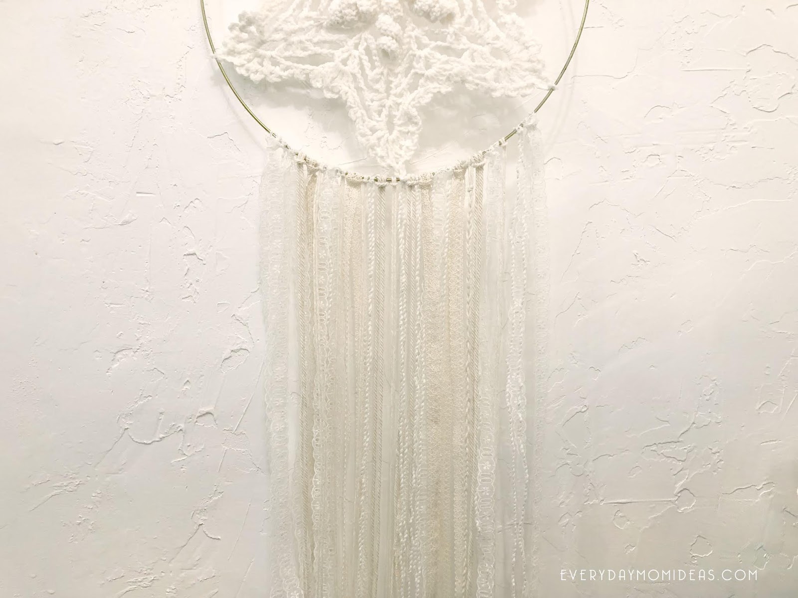 I love how dreamcatchers just show of thread textiles like lace, ribbon and yarn. In this Dream catcher you are just hanging strings of lace, ribbon and yarn over and over again. Not doing any fancy ties or weaves, just letting it be with a few knots and jingle bells and then putting in on display as itself.