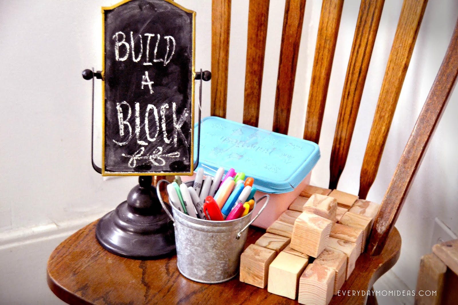 I love this activity because everyone can design blocks for the new baby to have as a toy and a keepsake. And guest can make them as simple or as intricate as they want. You can buy blank blocks to make your own at home if you have a ban saw. We made our own with left over 2×4 wood. I recommend using a ban saw to cut your 2×4 wood.