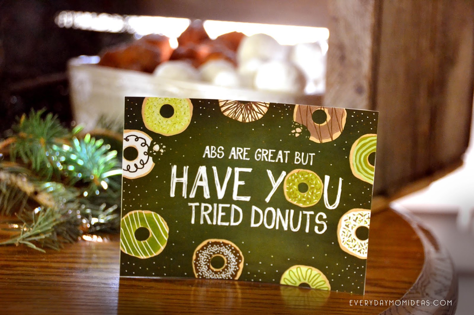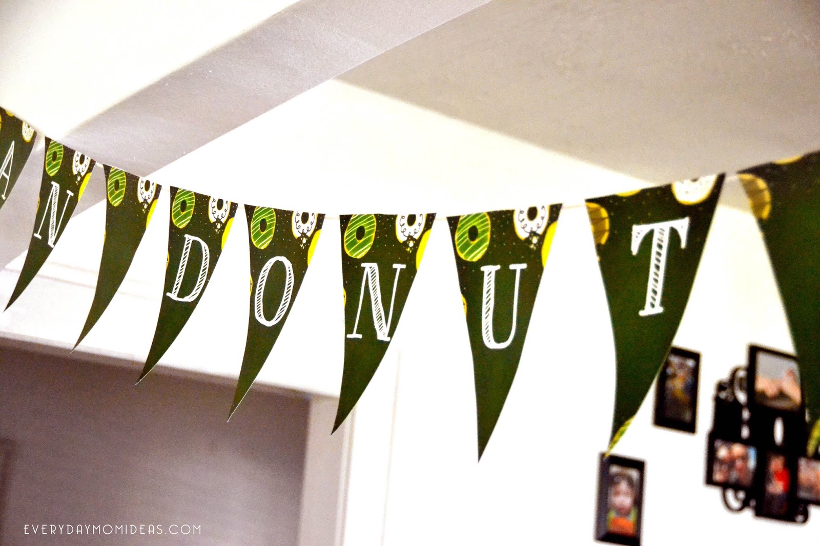 The Banner printable says Donut Sprinkle. Just print, cutout and glue to some string and this cute flag banner becomes a center piece for festiveness and donut eating.