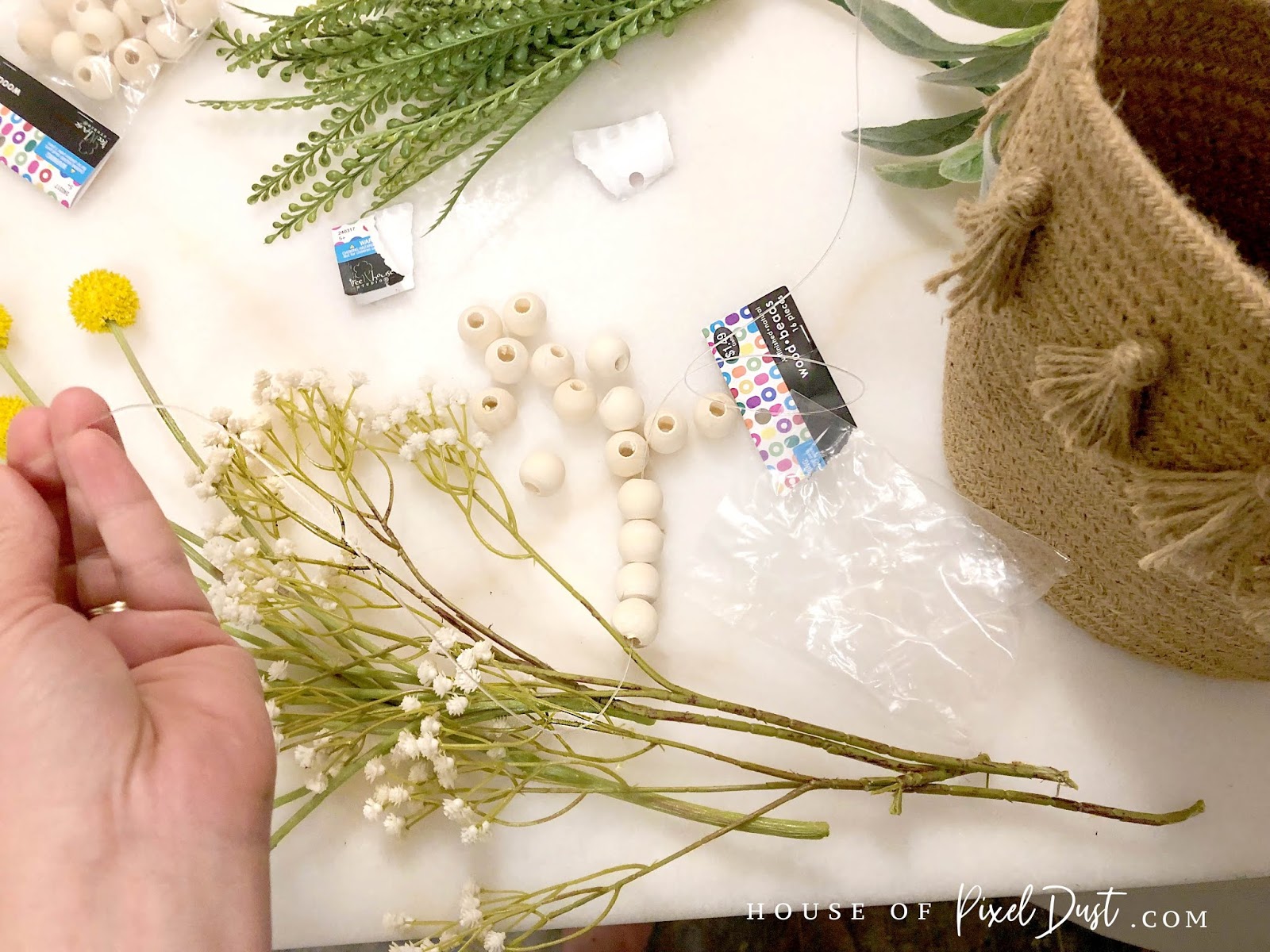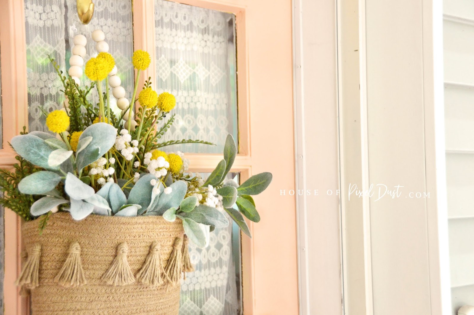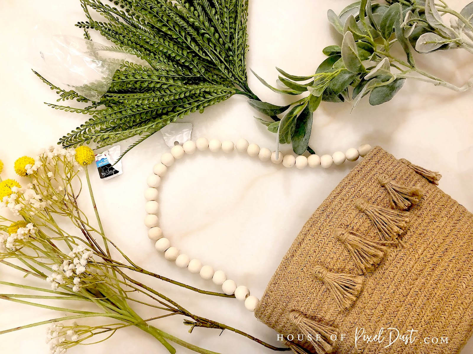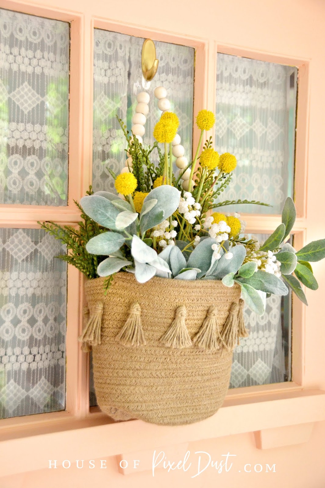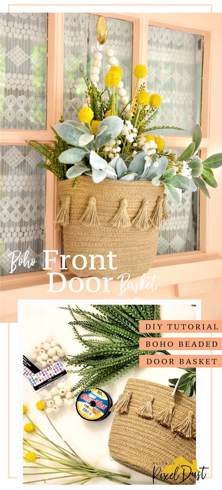 Front door baskets make great door decor because you can easily change out the flowers regularly to fit your mood, holiday and season. To add a little extra boho flavor I came up with the idea to add a beaded hanging rope instead of traditional string. The natural wood beads adds a little more thoughtful detail and character to this decor piece.