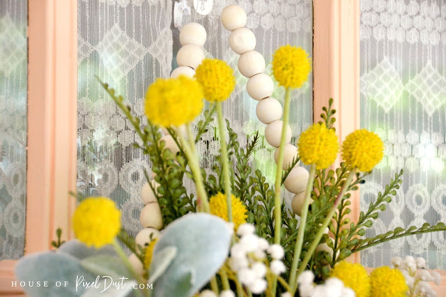 When considering my flower arrangement I wanted something that felt like dreamy summer days that was subtle and soft. I knew I wanted a pop of yellow but didn’t want to overpower my colorful door with tons of colors. I found these beautiful lambs ears (faux greenery), fern leaves and flowers at Hobby Lobby. I was so impressed with their collection. It was hard to not grab all the flowers. I had to remember less is more. I love how the different plants have so many different textures. This arrangement seems to be more about texture than anything else.