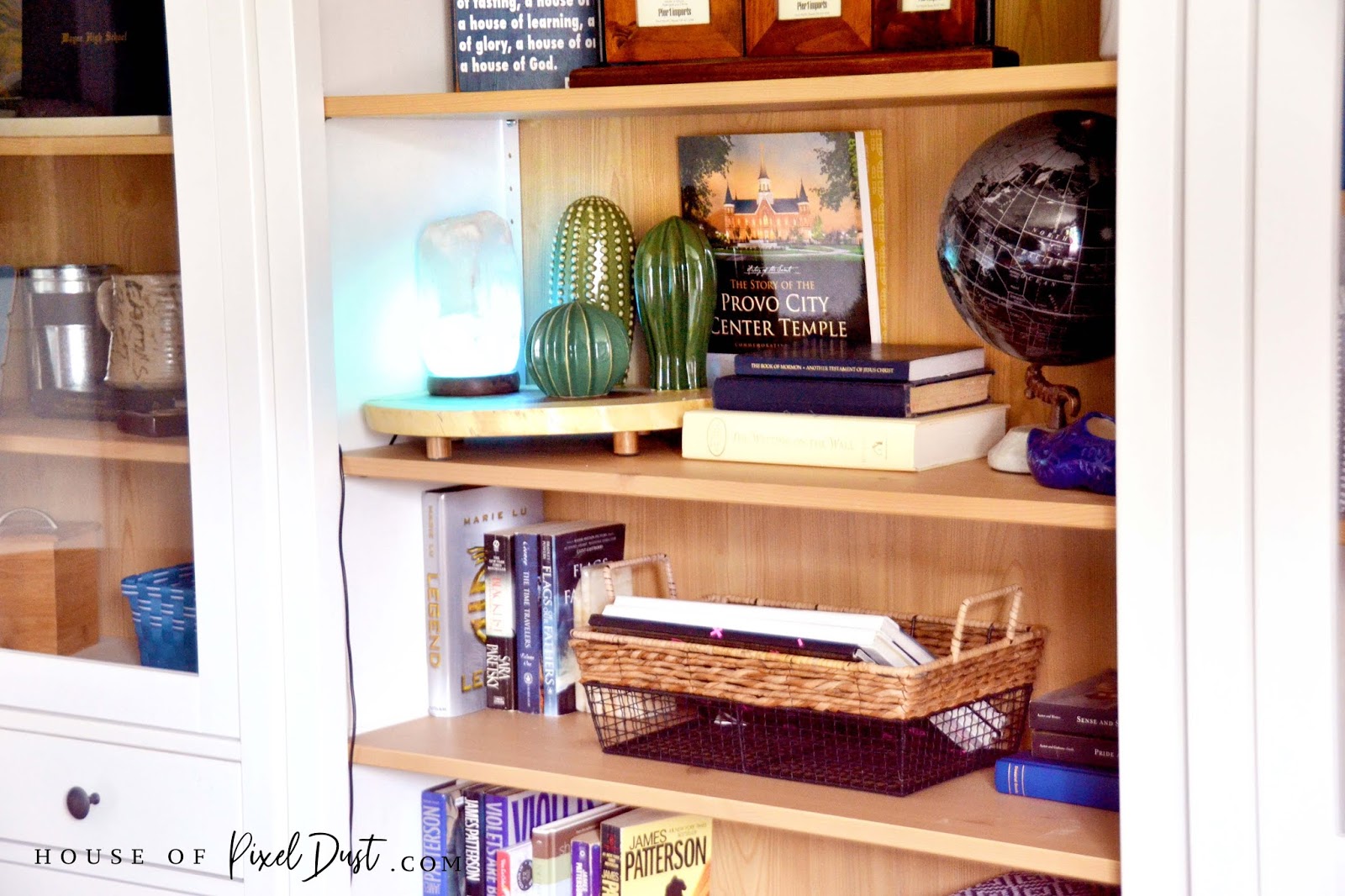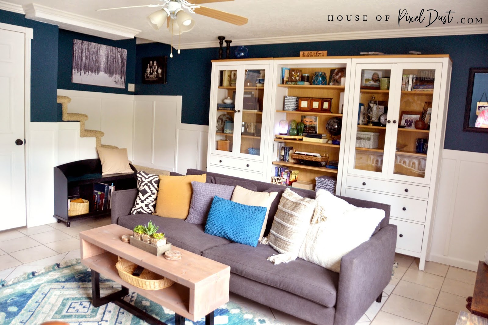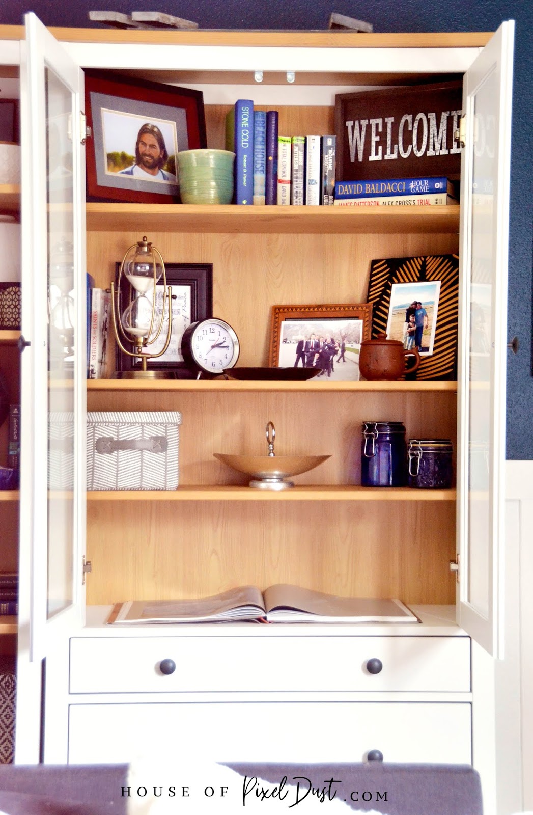 The bookcase in the background is a genius two tones HEMNES cabinet units from ikea. We bought two with door and drawers for tucking away storage items and then the middle book shelf with open storage. We put the three units together to add massive verticle storage and a great feature wall for all my brothers treasures.