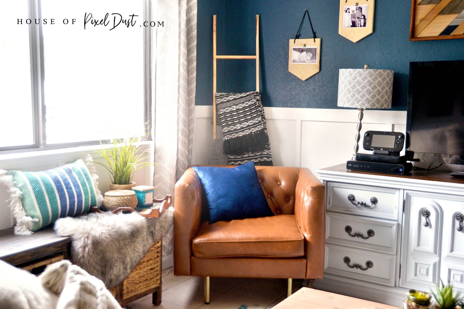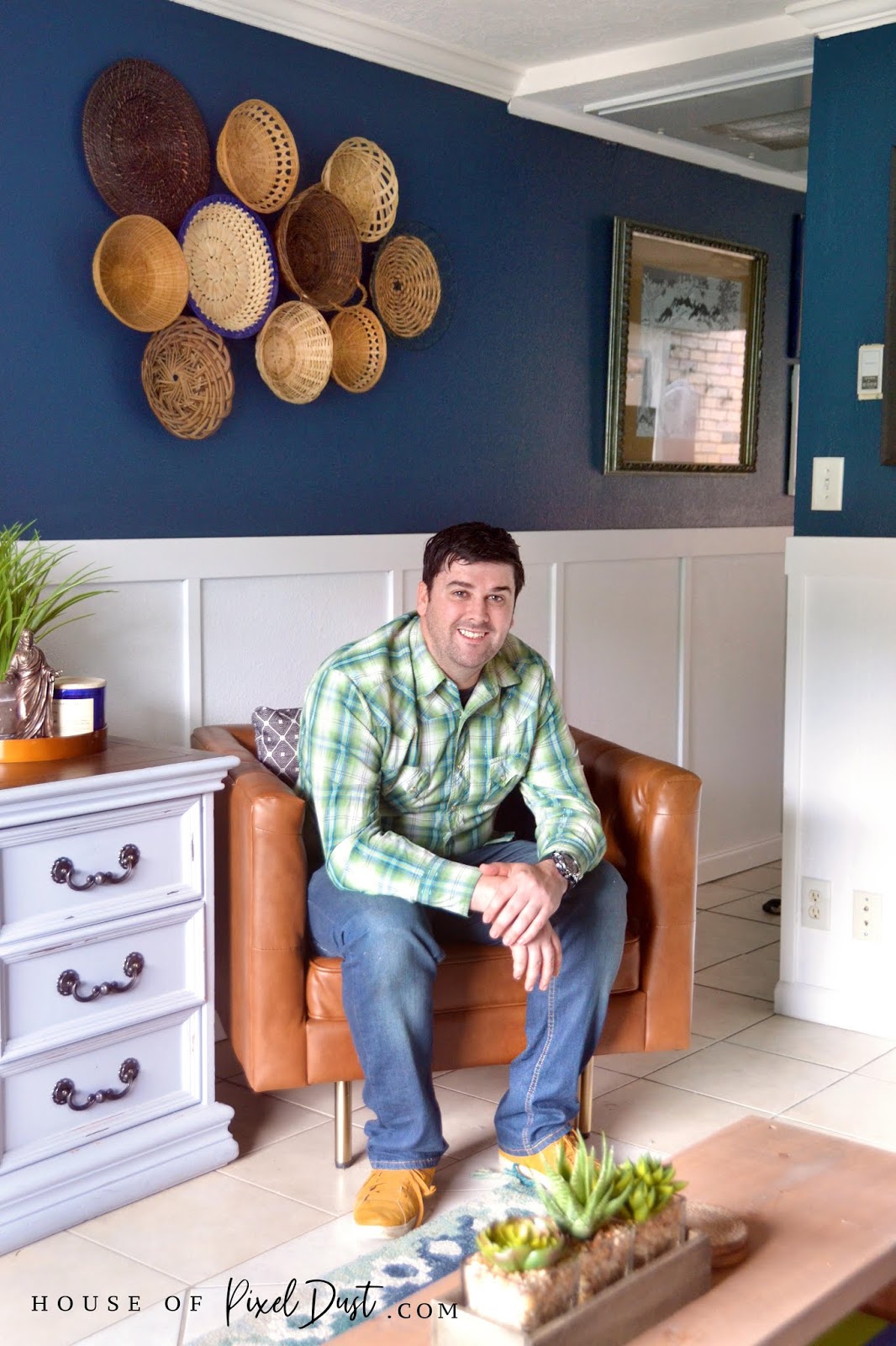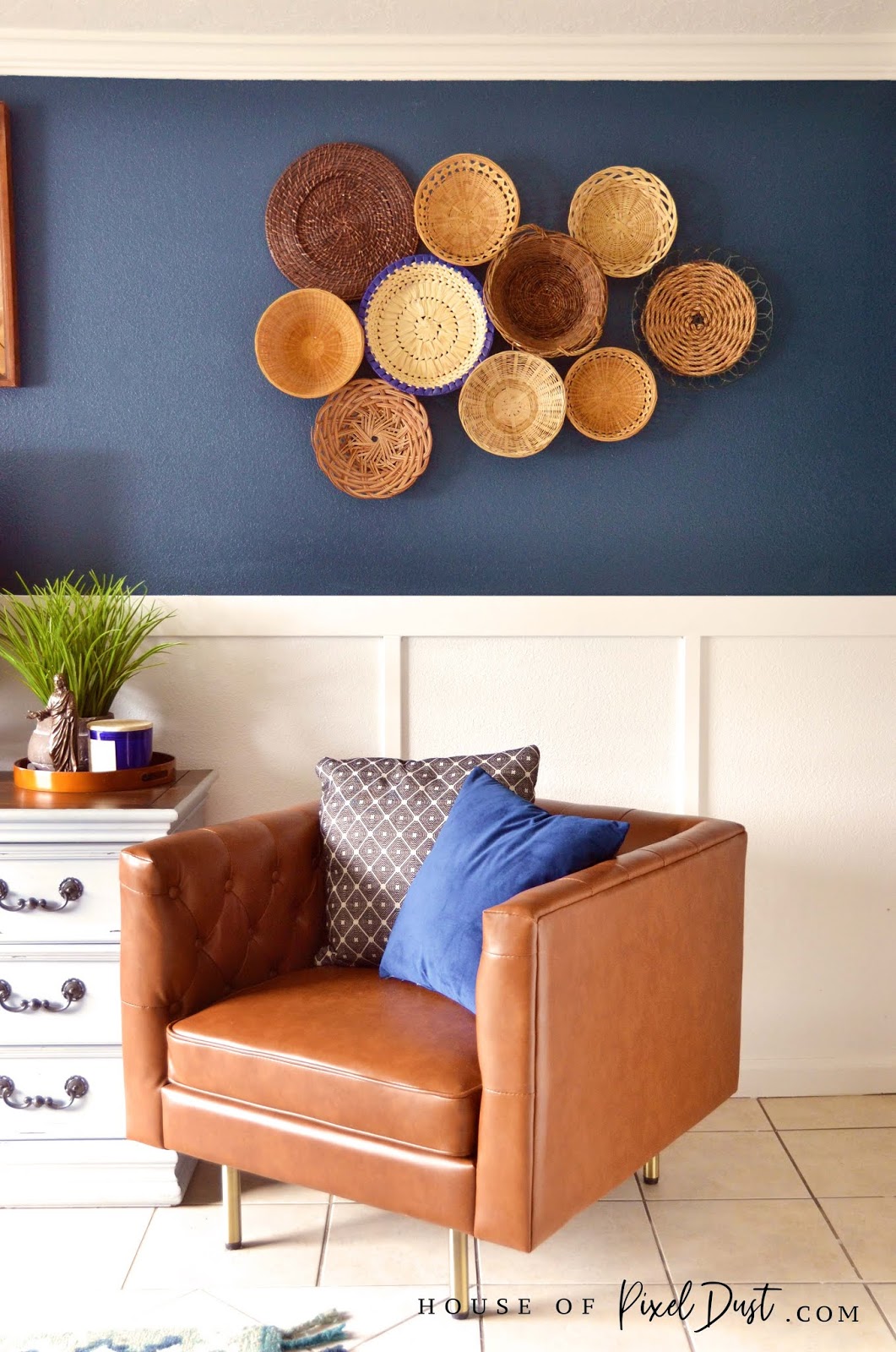 The basket wall art feature is my favorite thing in this space. It really catches the eye and brings in an earthy artistic statement. It really brings the whole goal of the room together. These we bought at thrifts stores for about a dollar each. If you would like to spruce your baskets up to look a little more high end try painting on details The brown faux leather chairs we found at the Home Store. The chairs add a hole lot of man glam to the space and look expensive but they are totally not. The Home store is a great place to find cute furniture on a small budget.