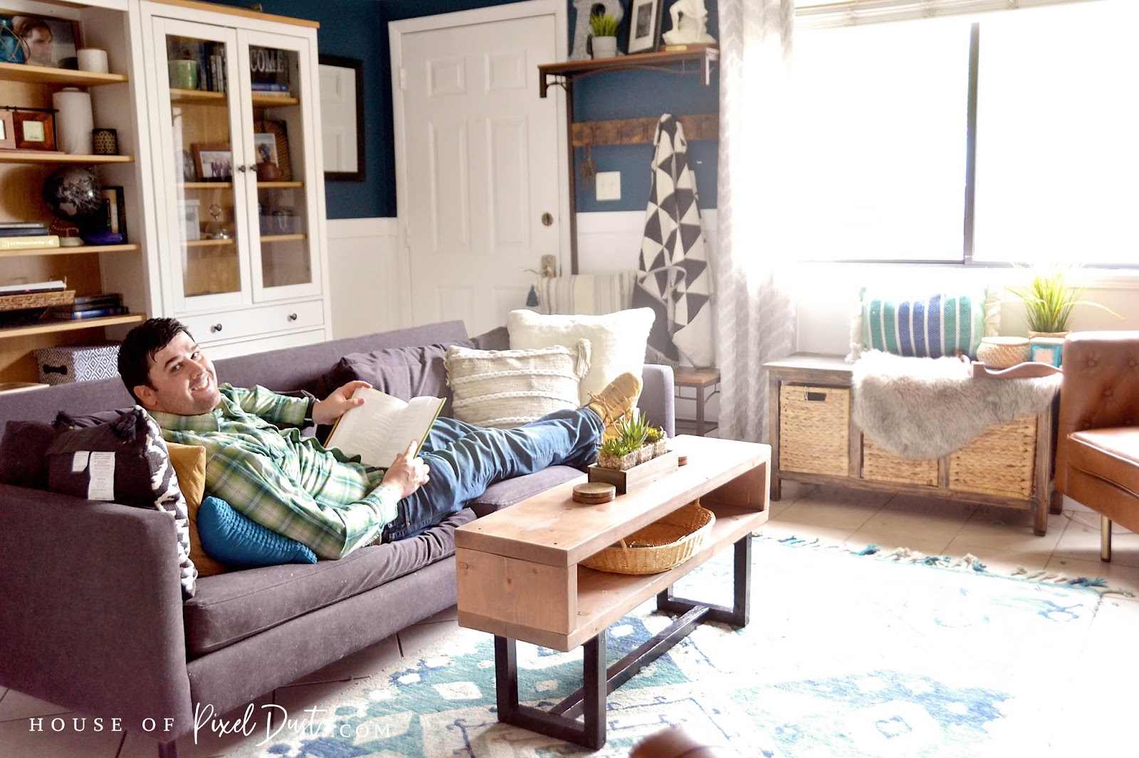 The Modern Wood Coffee Table I made myself. Its a super easy project anyone can do if you have a chop saw and a drill. It takes about 1 hour to make plus dry time. You can get the full modern coffee table tutorial here and this previous blog post and get the step by step instructions to make your own.