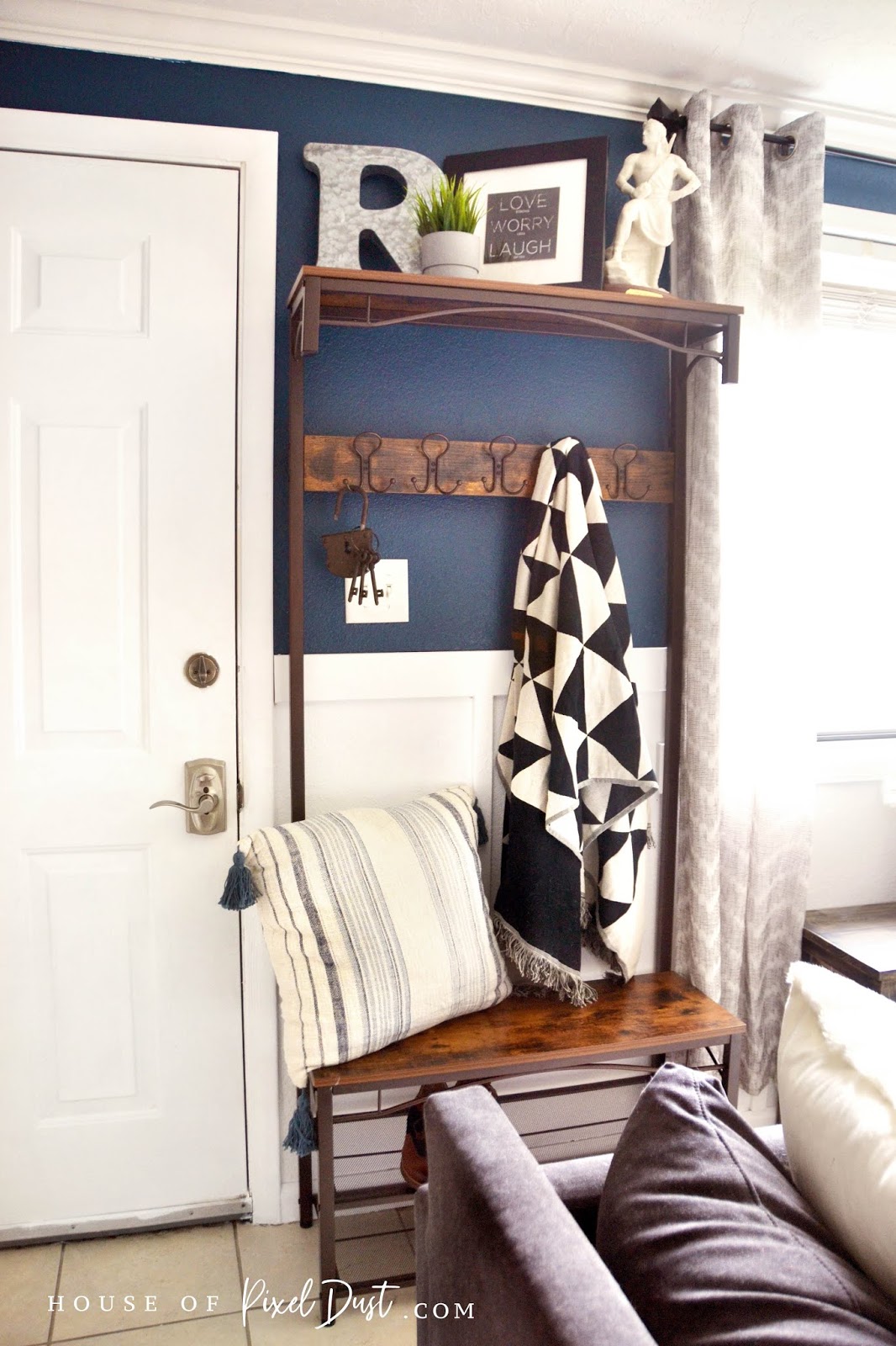 We found this adorable hallway tree on Amazon for an amazing price. This industrial coat rack was essential here because is solves a number of issues. We wanted vertical storage right by the front door but the other hall trees had beadboard backing. And as you can see the living room light switch is also right there on the wall and we couldn’t cover it up, so we needed something that had an open back plus some racks for store shoes, coats and has above storage for hats and gloves we could store in a basket of some sort.