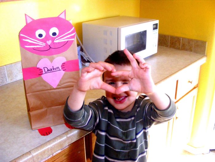 Forget the valentine box... we made this easy valentine holder with some crate paper and a brown paper bag!My six year old wanted a kitty cat valentine holder this year because he just got his first pet …